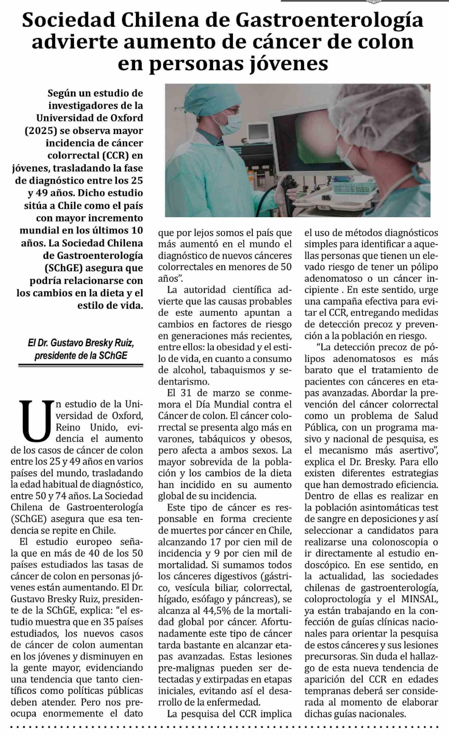 Sociedad Chilena de Gastroenterologia advierte aumento de cáncer de colon en personas jóvenes
