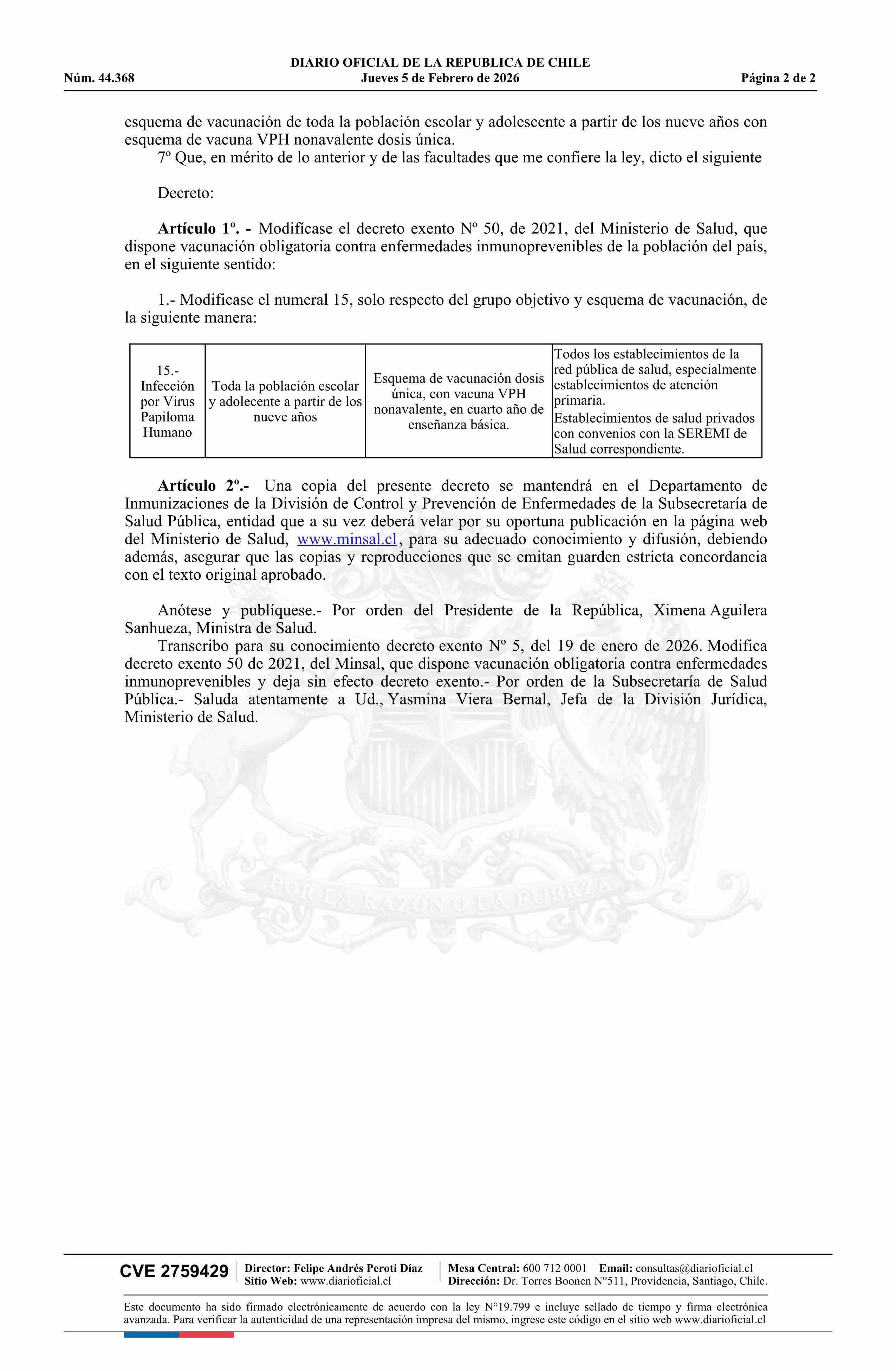 | Título: | Decreto exento número 5, de 2026.- Modifica decreto Nº 50 exento, de 2021, que dispone vacunación obligatoria contra enfermedades inmunoprevenibles y deja sin efecto decreto exento que indica |