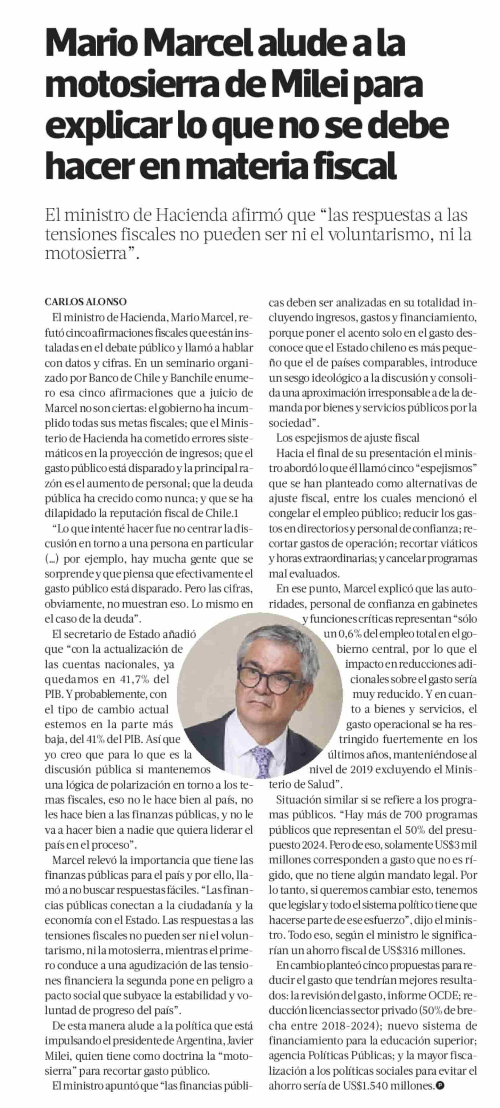 Mario Marcel alude a la motosierra de Milei para explicar lo que no se debe hacer en matenía fiscal