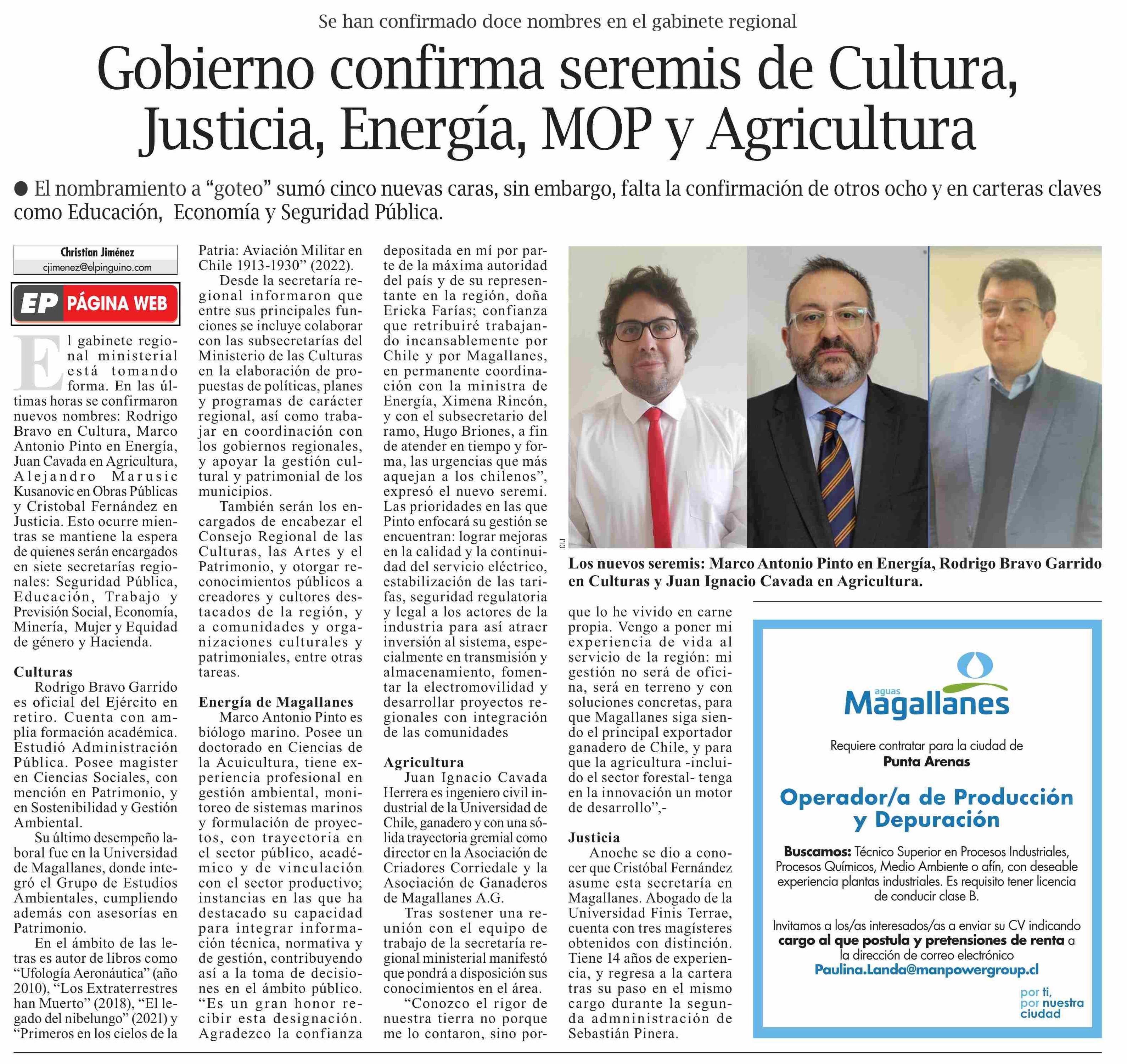 Gobierno confirma seremis de Cultura, Justicia, Energía, MOP y Agricultura