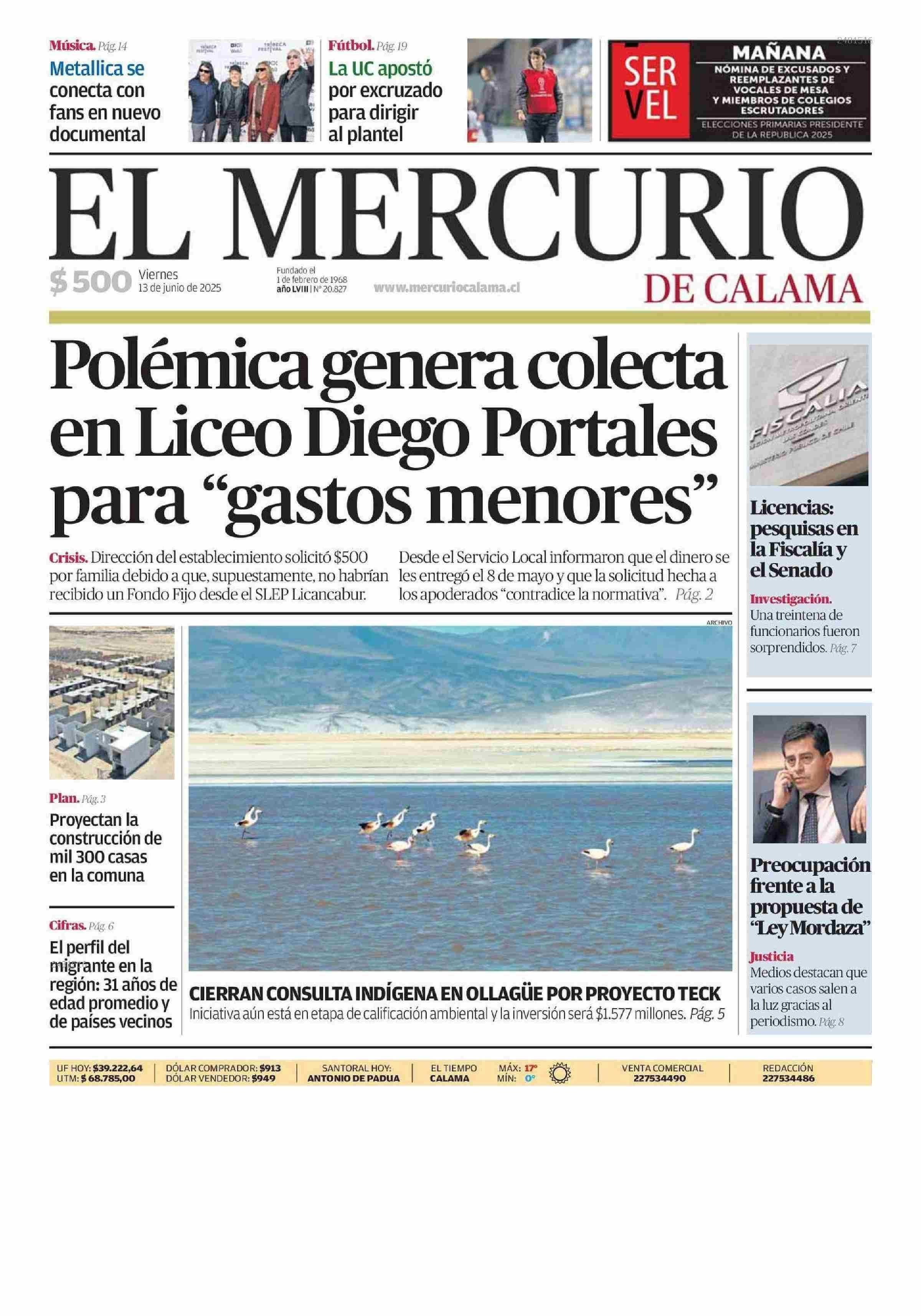 PORTADA EL MERCURIO DE CALAMA CHILE