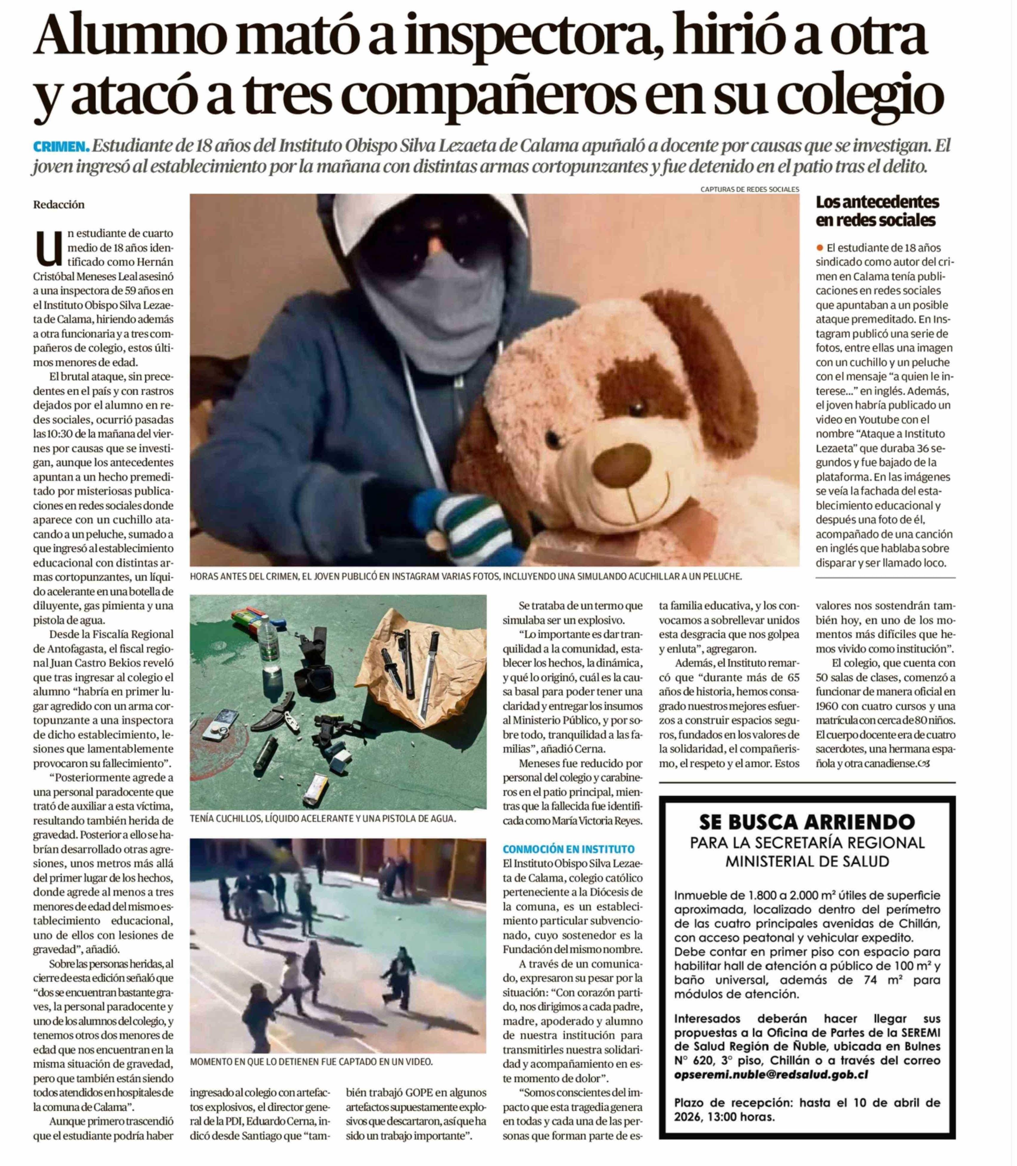 Alumno mató a inspectora, hirió a otra y atacó a tres compañeros en su colegio