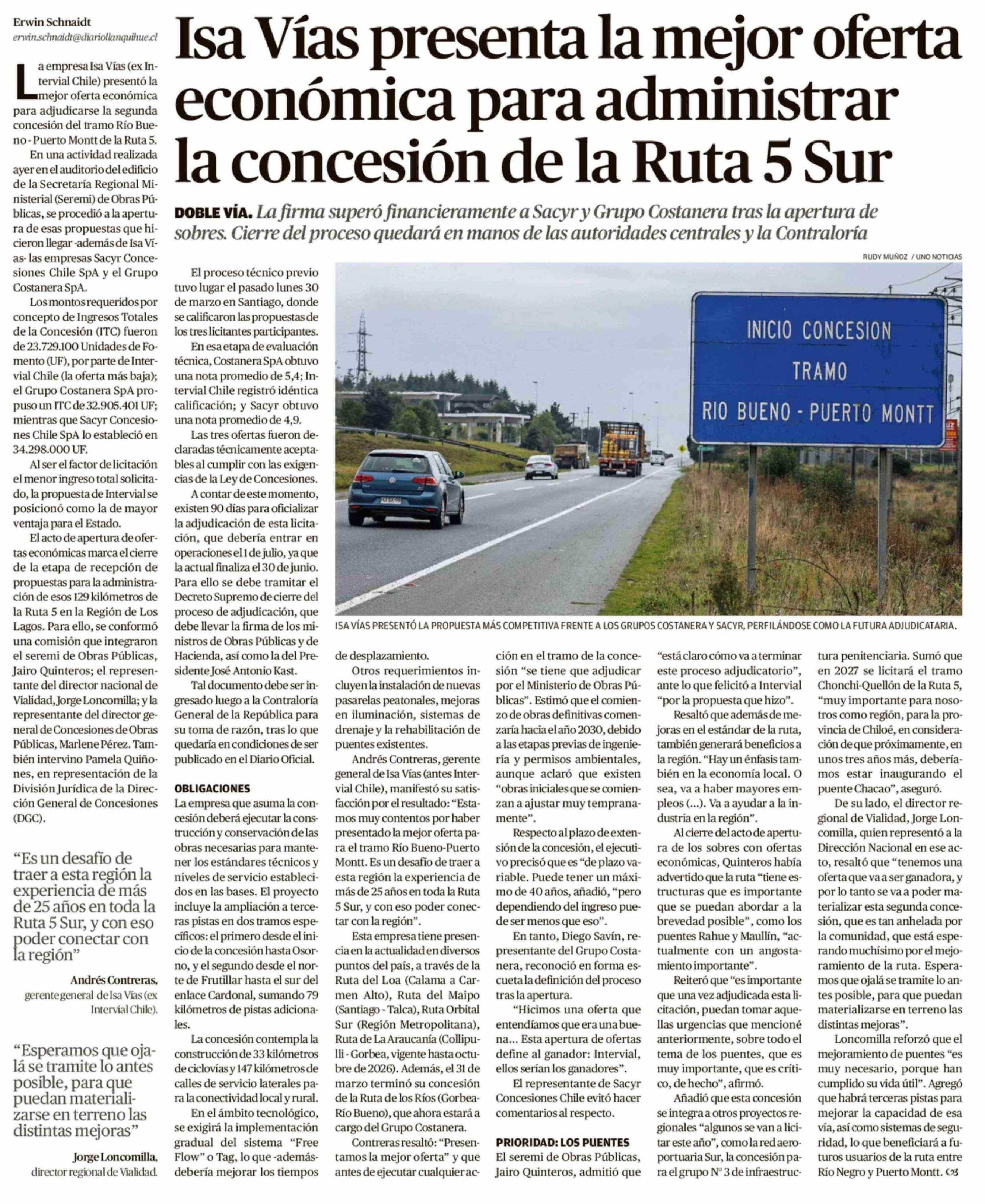 Isa Vías presenta la mejor oferta económica para administrar la concesión de la Ruta 5 Sur