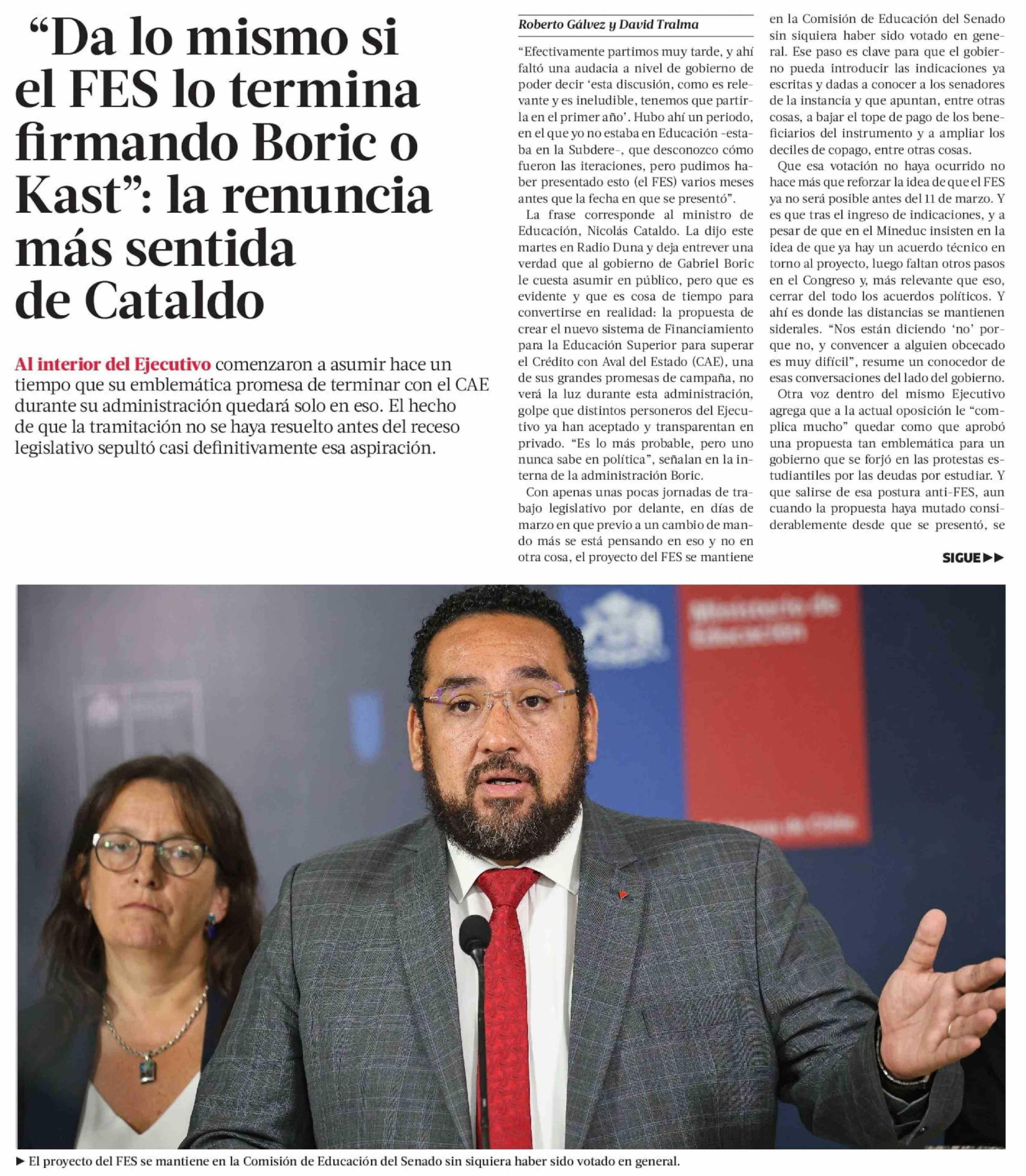 Título: "Da lo mismo si el FES lo termina firmando Boric o Kast": la renuncia más sentida de Cataldo
