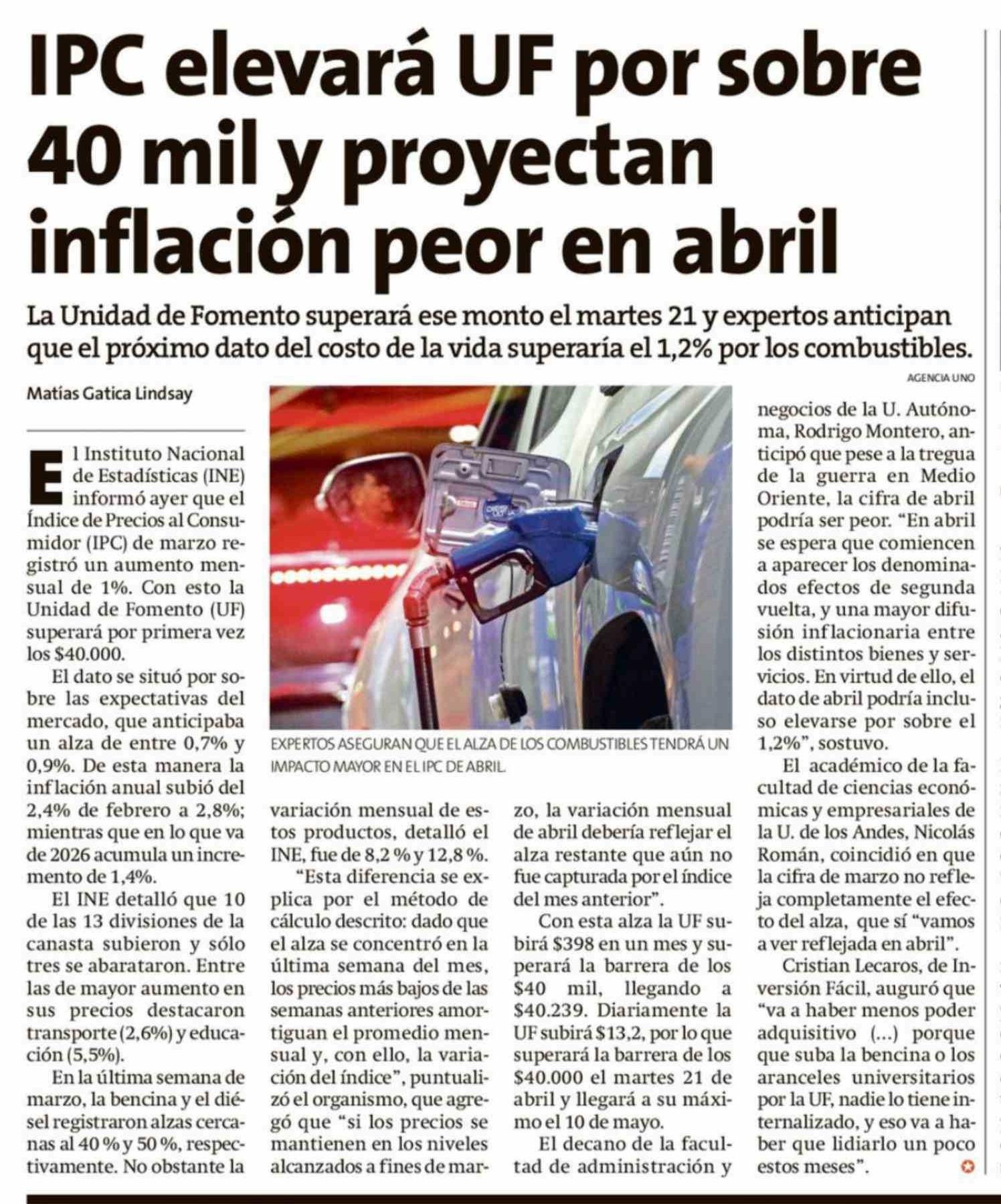 IPC elevará UF por sobre 40 mil y proyectan inflación peor en abril