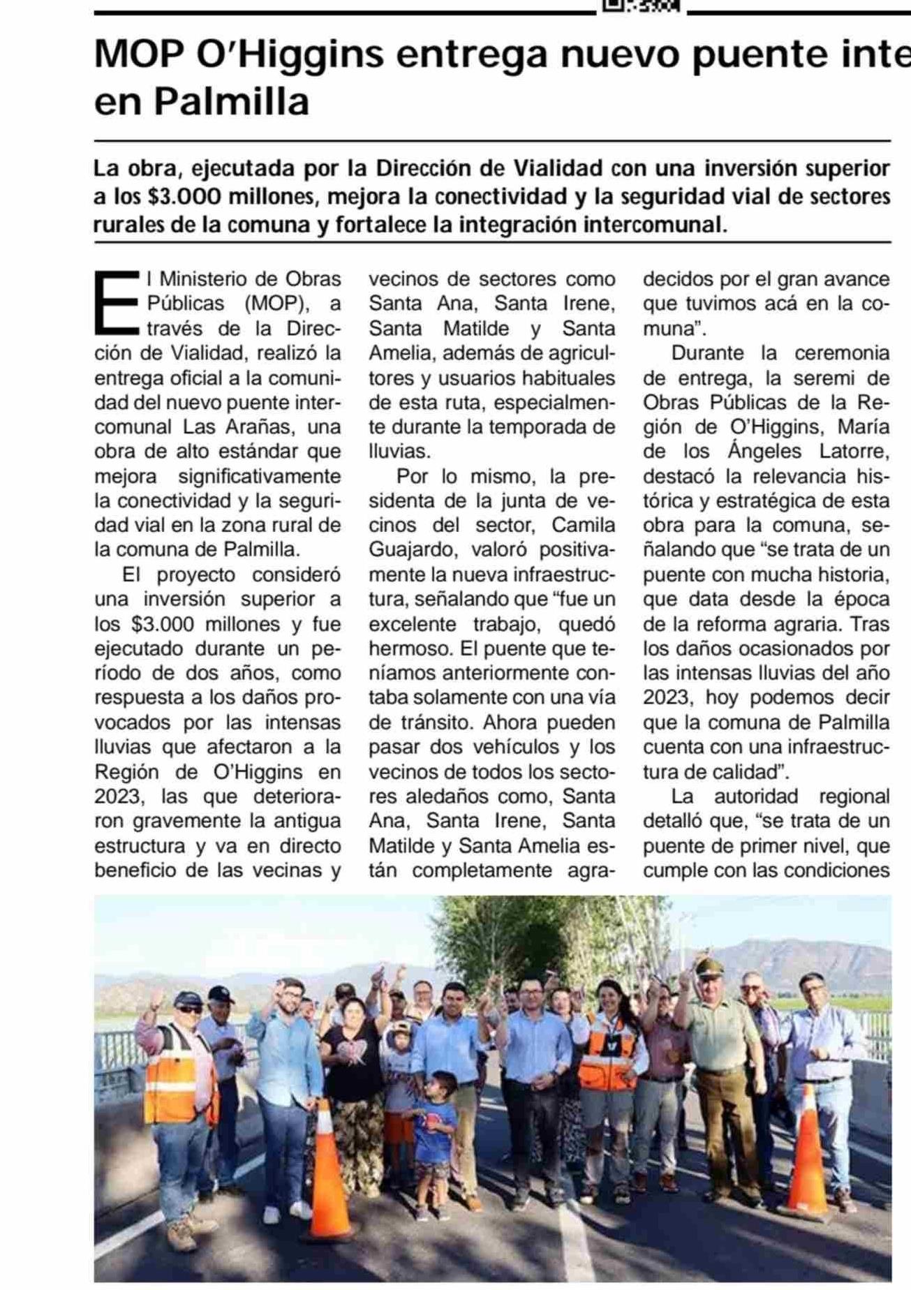 MOP O’Higgins entrega nuevo puente intercomunal Las Arañas en Palmilla