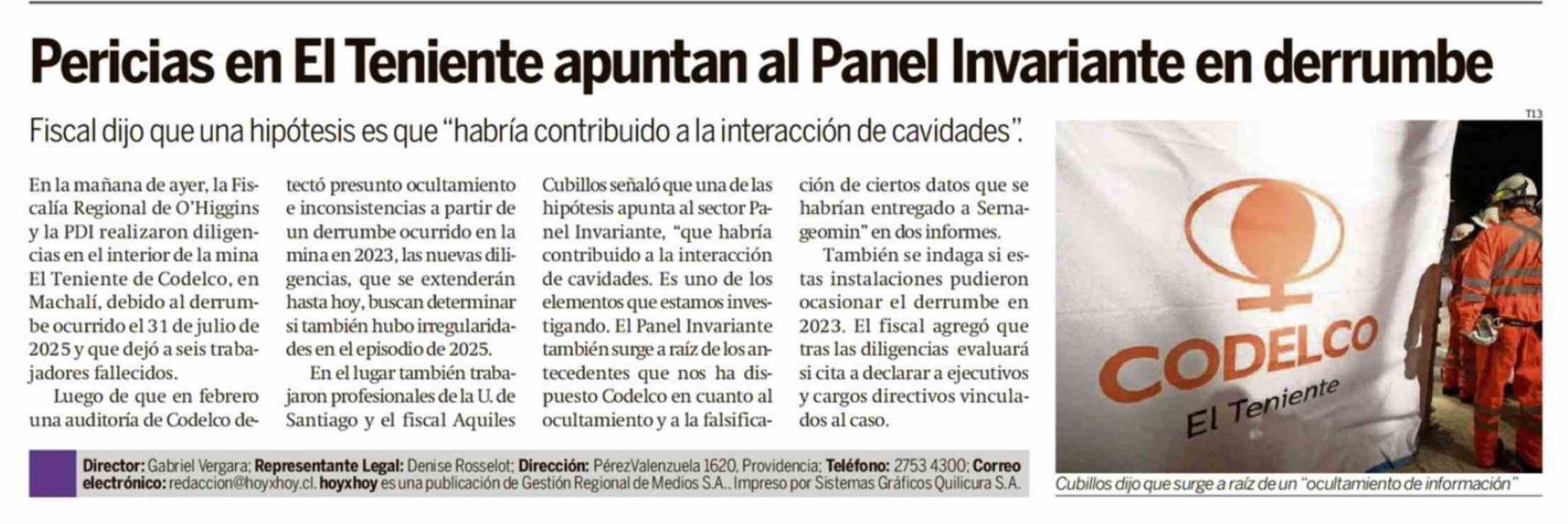 Pericias en El Teniente apuntan al Panel Invariante en derrumbe