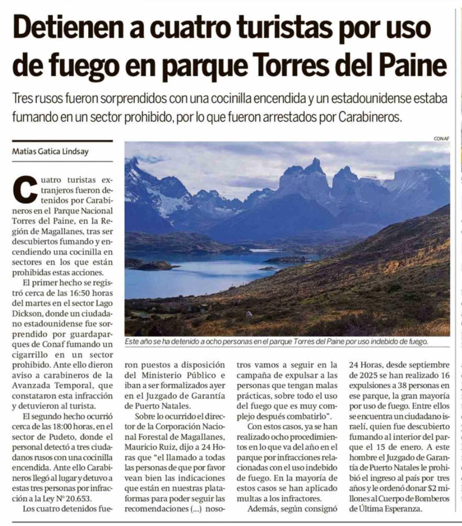 Detienen a cuatro turistas por uso de fuego en parque Torres del Paine