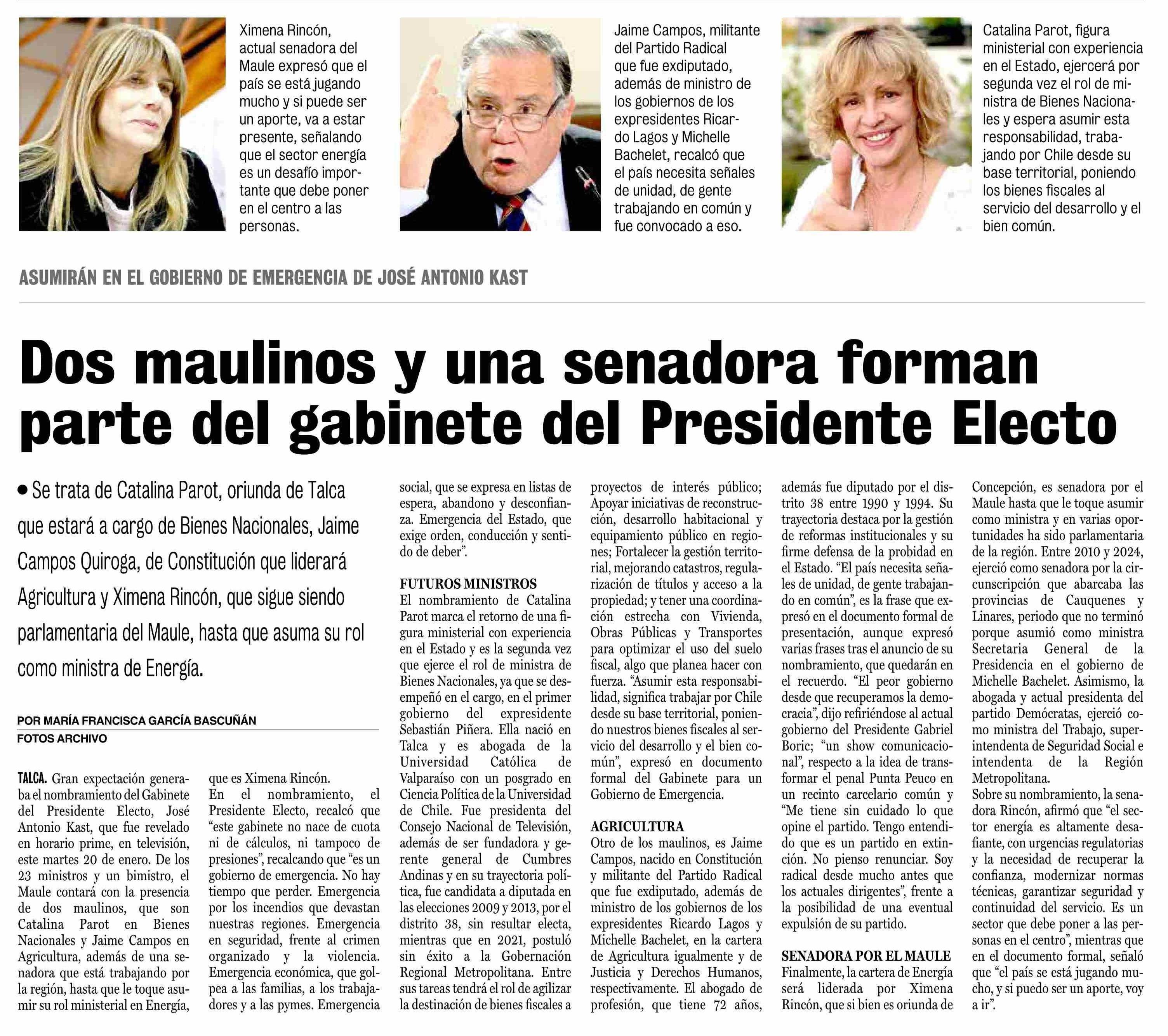 Dos maulinos y una senadora forman parte del gabinete del Presidente Electo