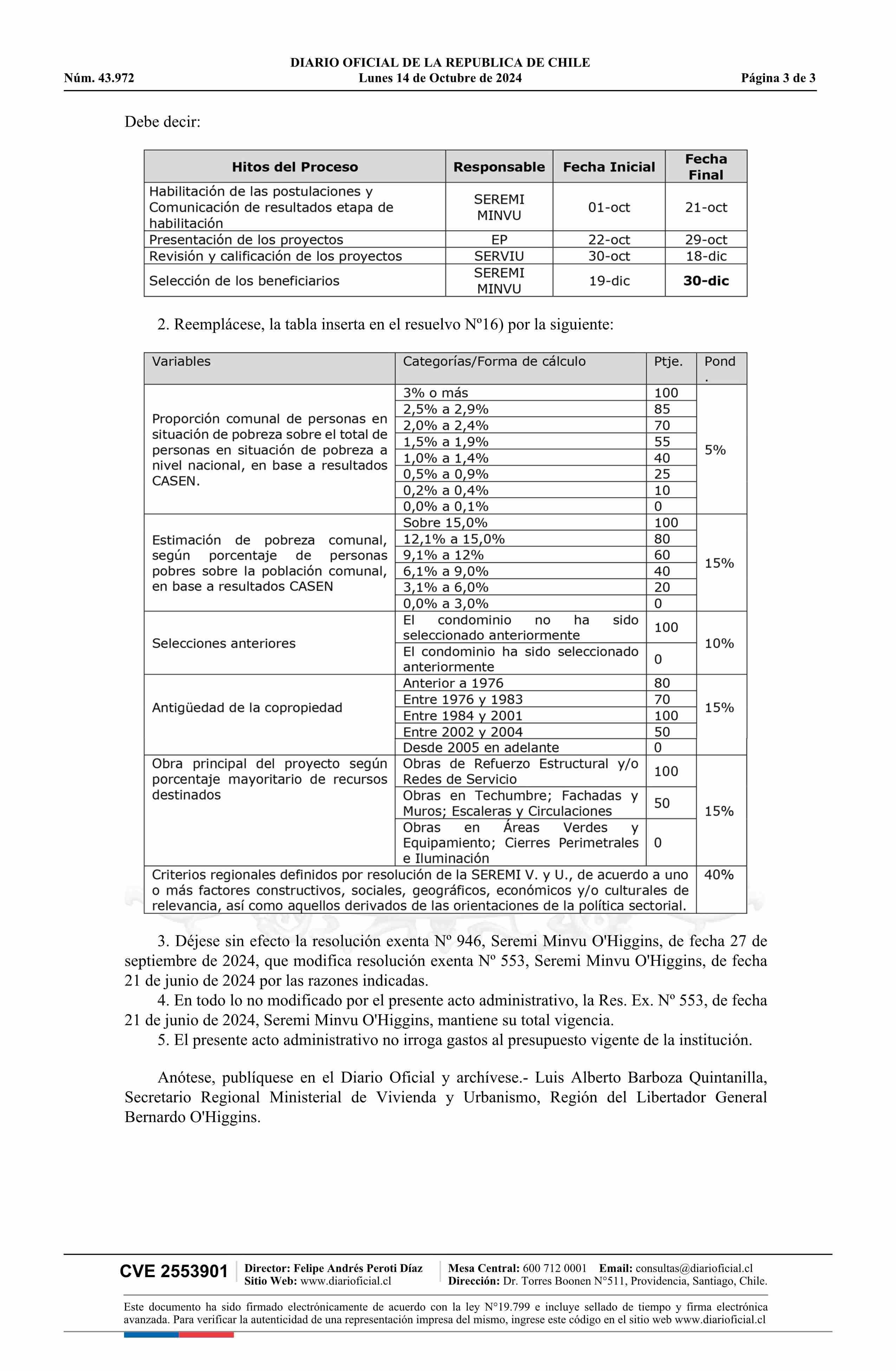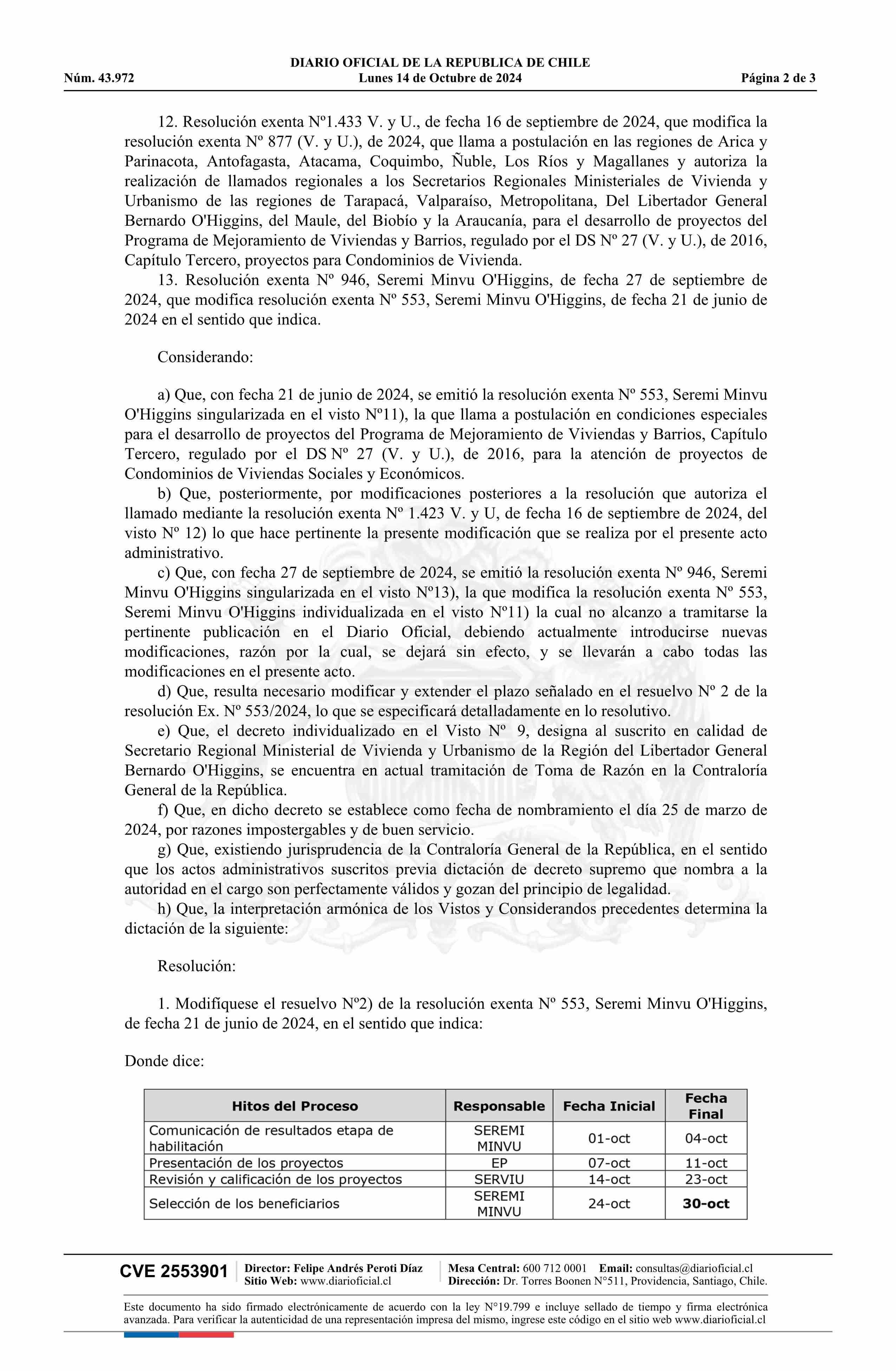 | Título: | Resolución exenta número 967, de 2024.- Modifica resolución Nº 553 exenta, de 2024, en el sentido que indica y deja sin efecto la resolución Nº 946 exenta, de 2024 |