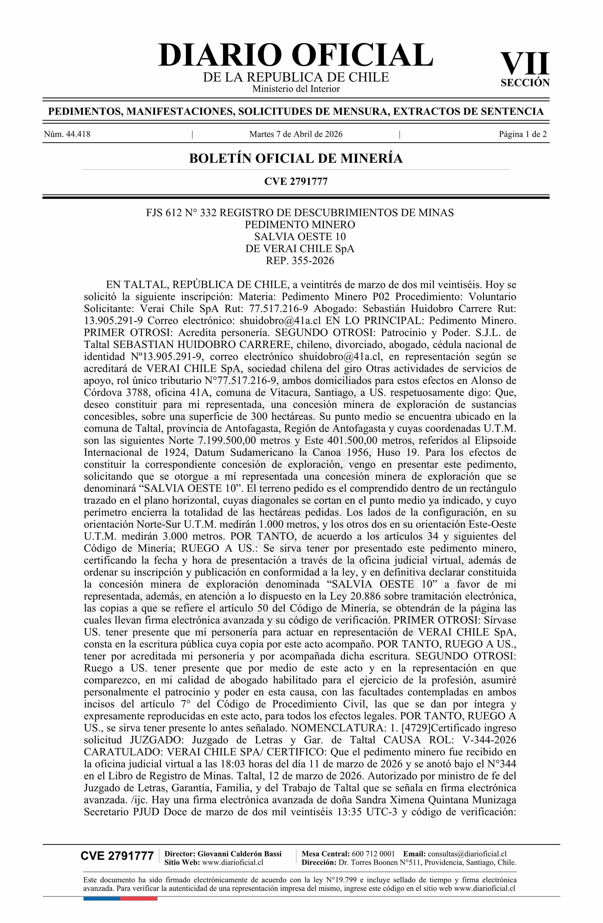 DIARIO OFICIAL CHILE - BOLETÍN OFICIAL DE MINERÍA (DIARIO OFICIAL CHILE – BOM – PEDIMENTOS MINEROS)