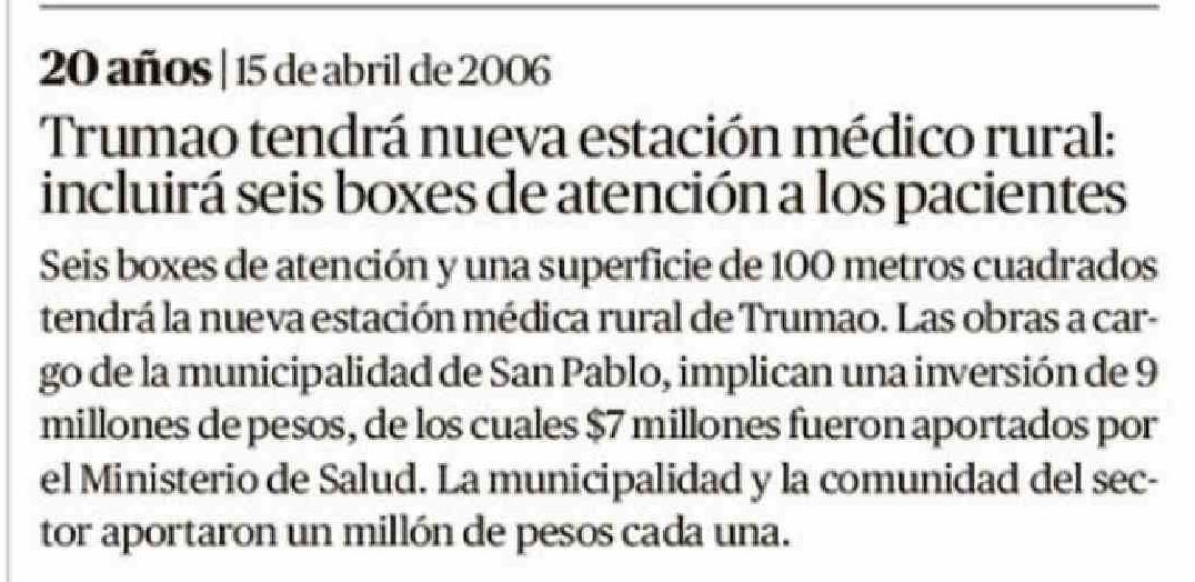 Título: 20 años | 15 de abril de 2006 Trumao tendrá nueva estación médico rural: incluirá seis boxes de atención a los pacientes Seis boxes de atención y una superficie de 100 metros cuadrados tendrá la nueva estación médica rural de Trumao. Las obras a cargo de la municipalidad de San Pablo, implican una i