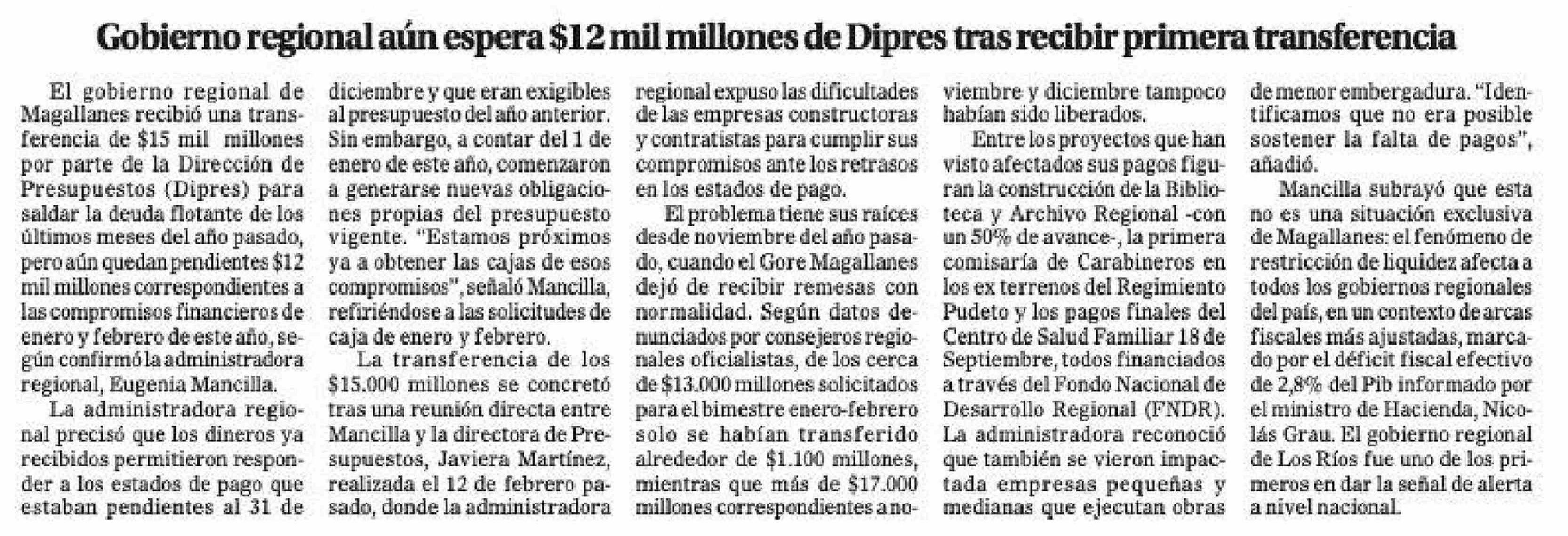 Gobierno regional aún espera $12 mil millones de Dipres tras recibir primera transferencia