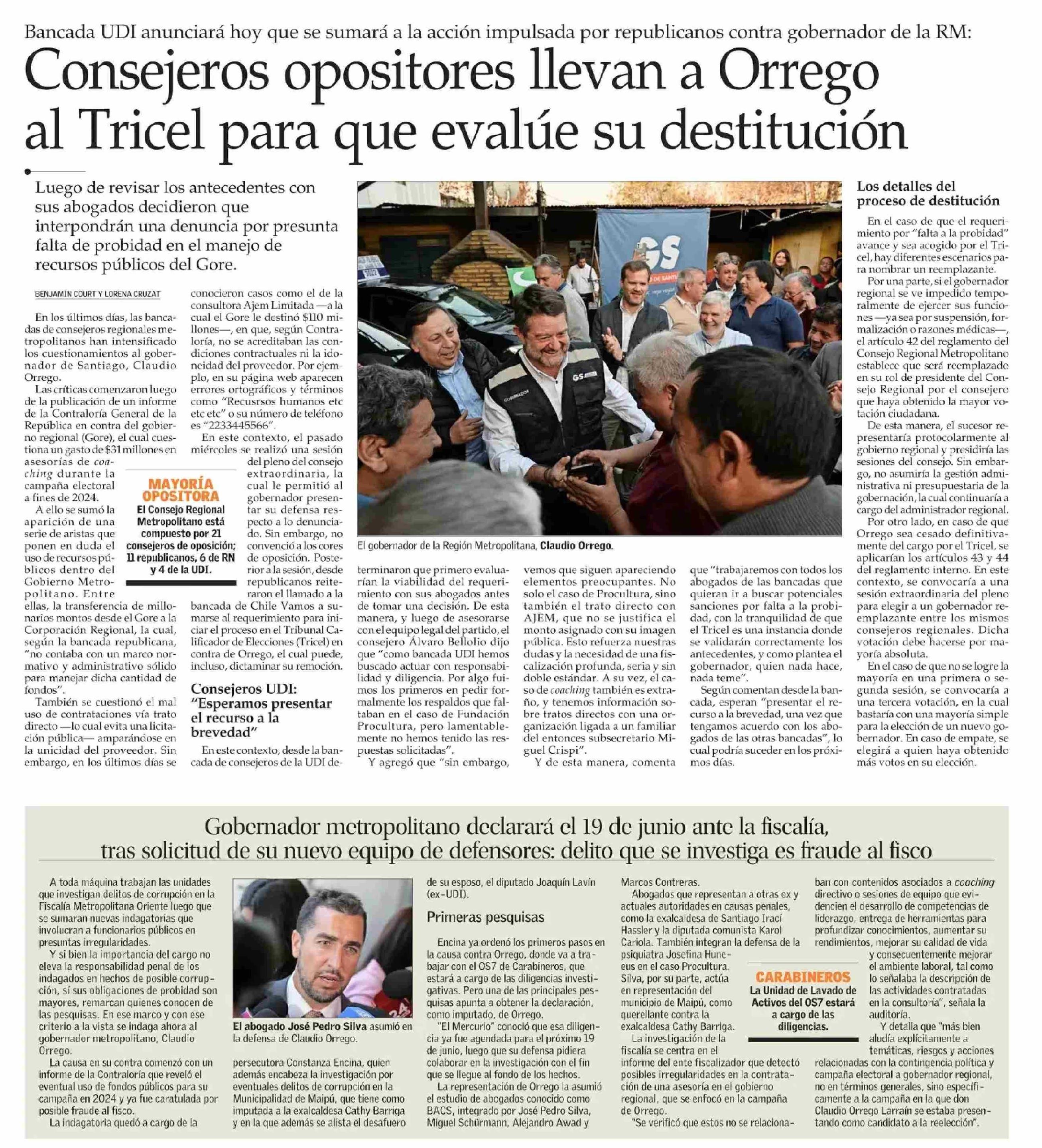 Consejeros opositores llevan a Orrego al Tricel para que evalúe su destitución