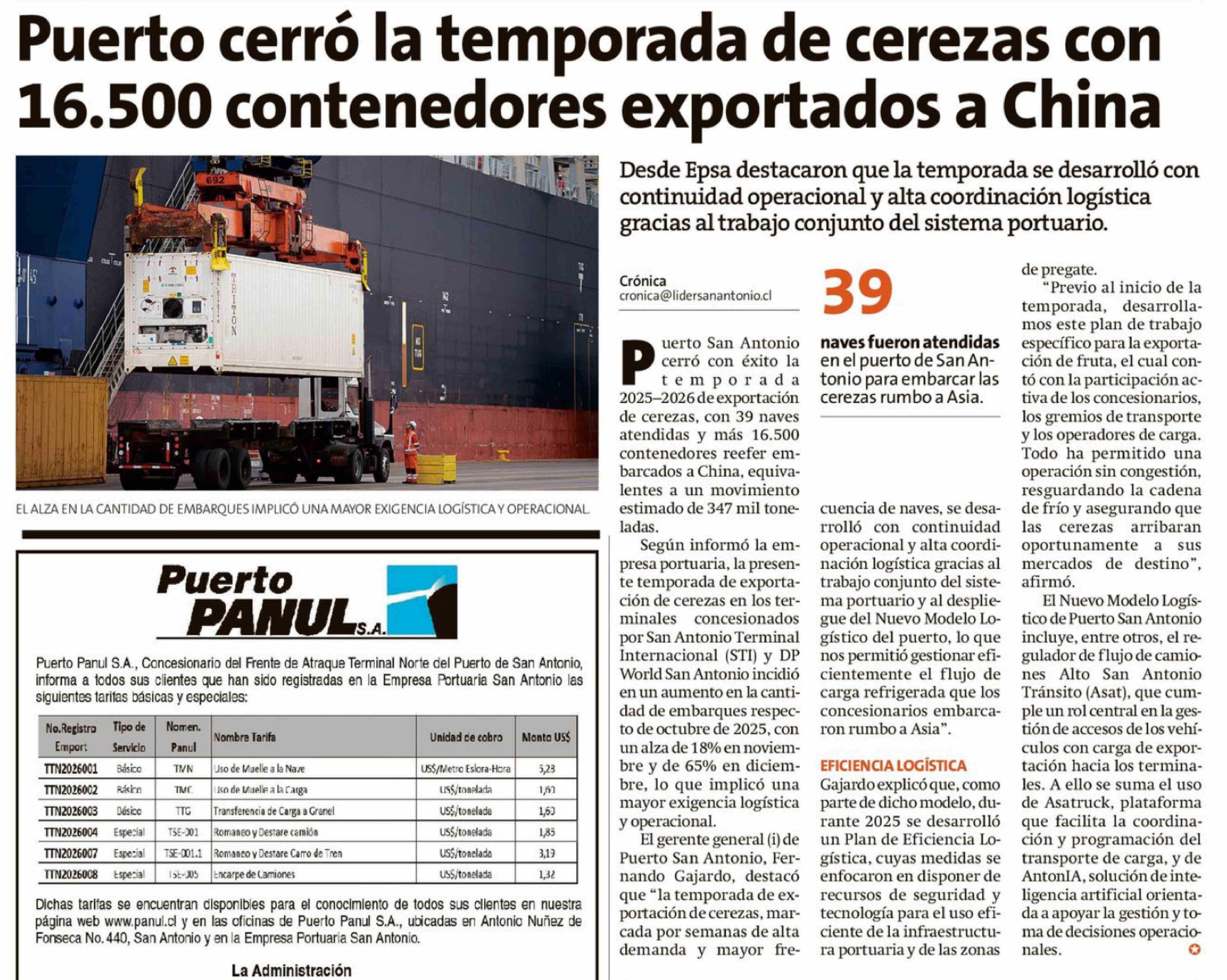 Puerto cerró la temporada de cerezas con 16.500 contenedores exportados a China