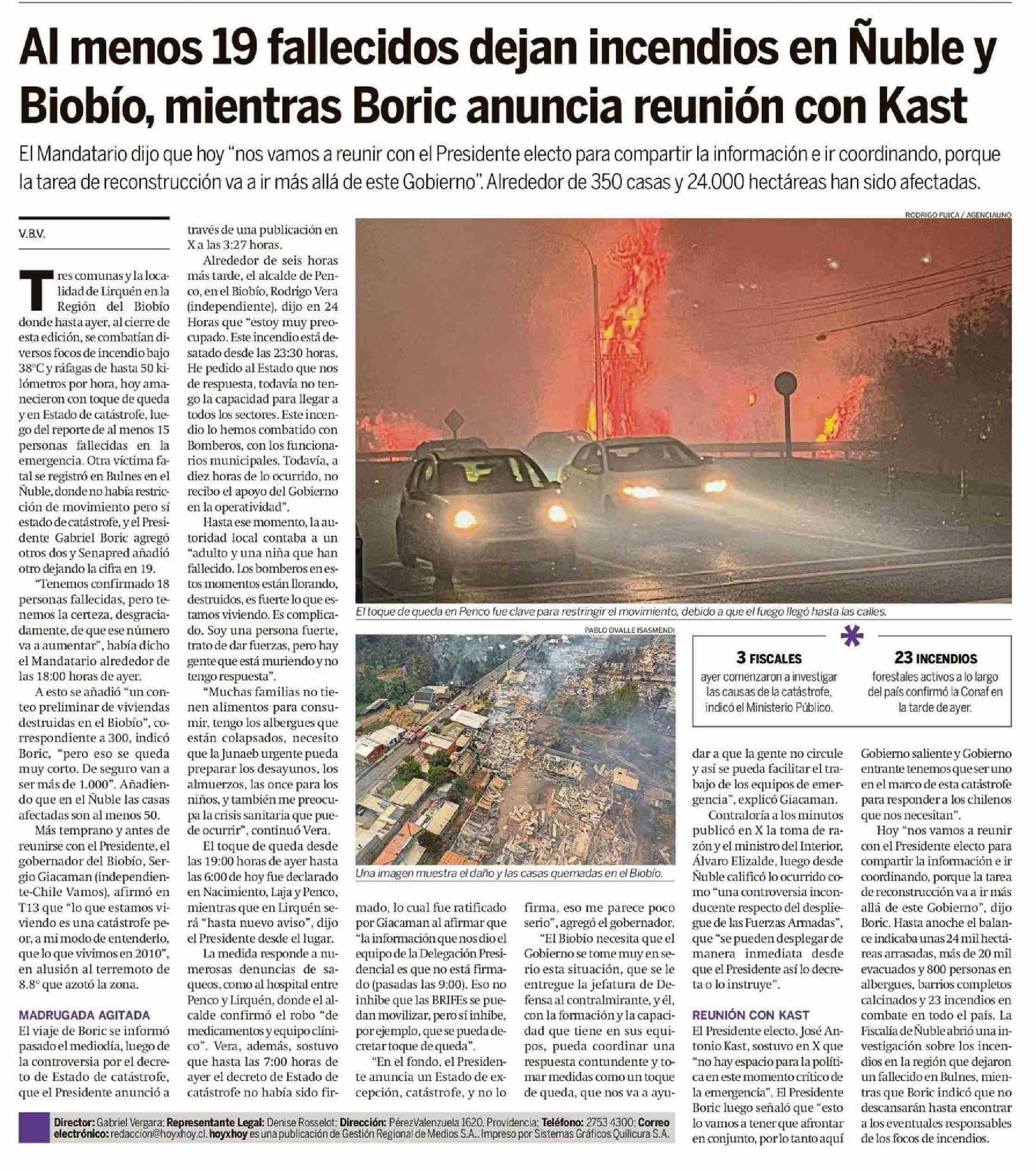 Título: Al menos 19 fallecidos dejan incendios en Ñuble y Biobio, mientras Boric anuncia reunión con Kast