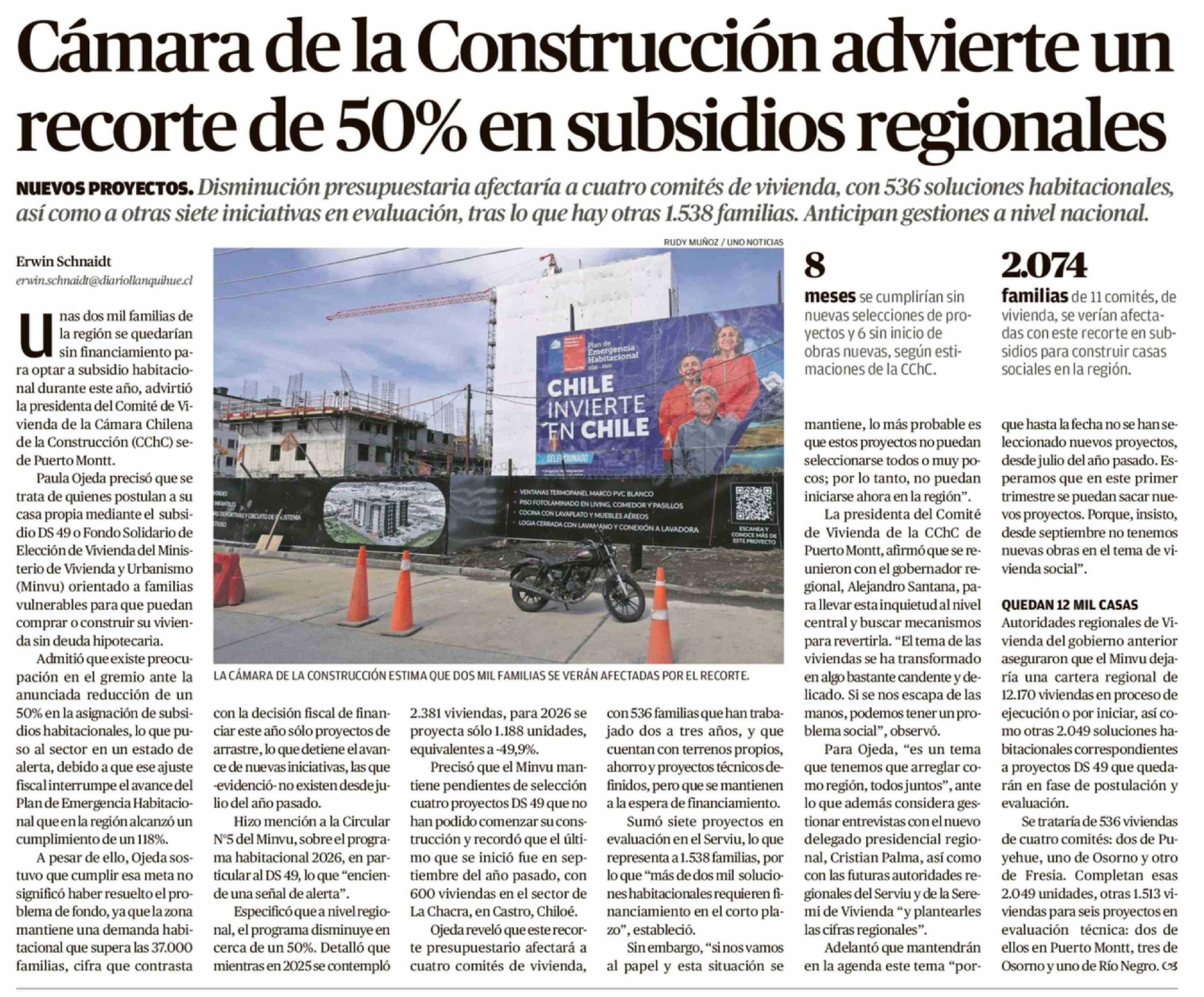 Cámara de la Construcción advierte un recorte de 50% en subsidios regionales