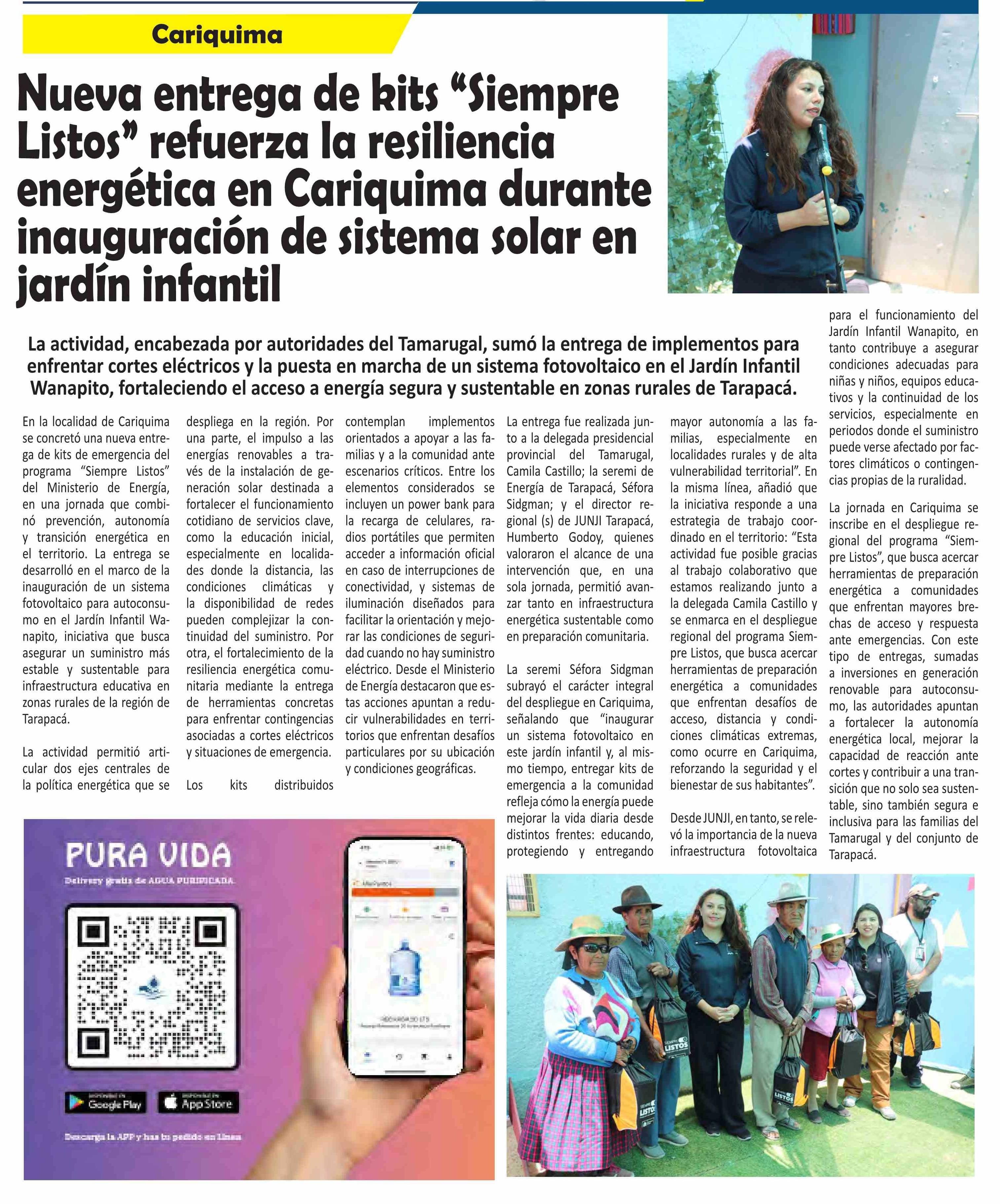 Nueva entrega de kits "Siempre Listos" refuerza la resiliencia energética en Cariquima durante inauguración de sistema solar en jardín infantil