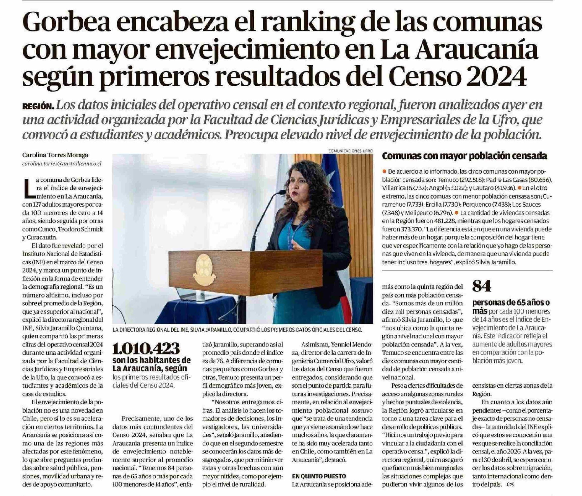 Gorbea encabeza el ranking de las comunas con mayor envejecimiento en La Araucanía según primeros resultados del Censo 2024