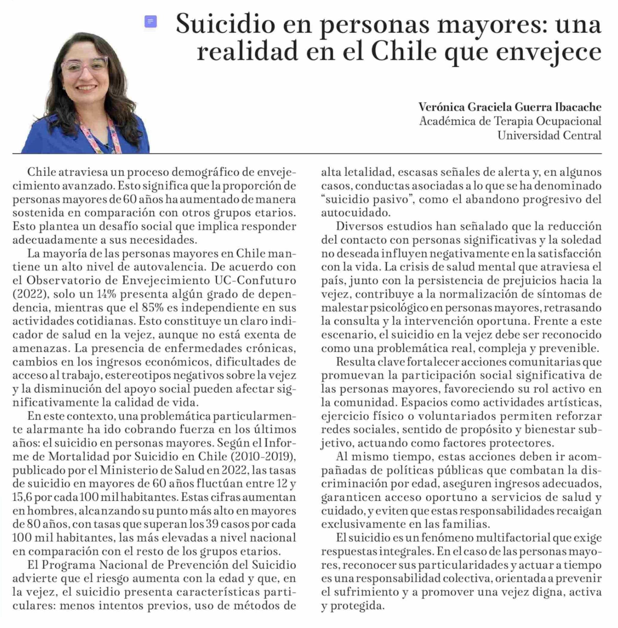 Columnas de Opinión: Suicidio en personas mayores: una realidad en el Chile que envejece