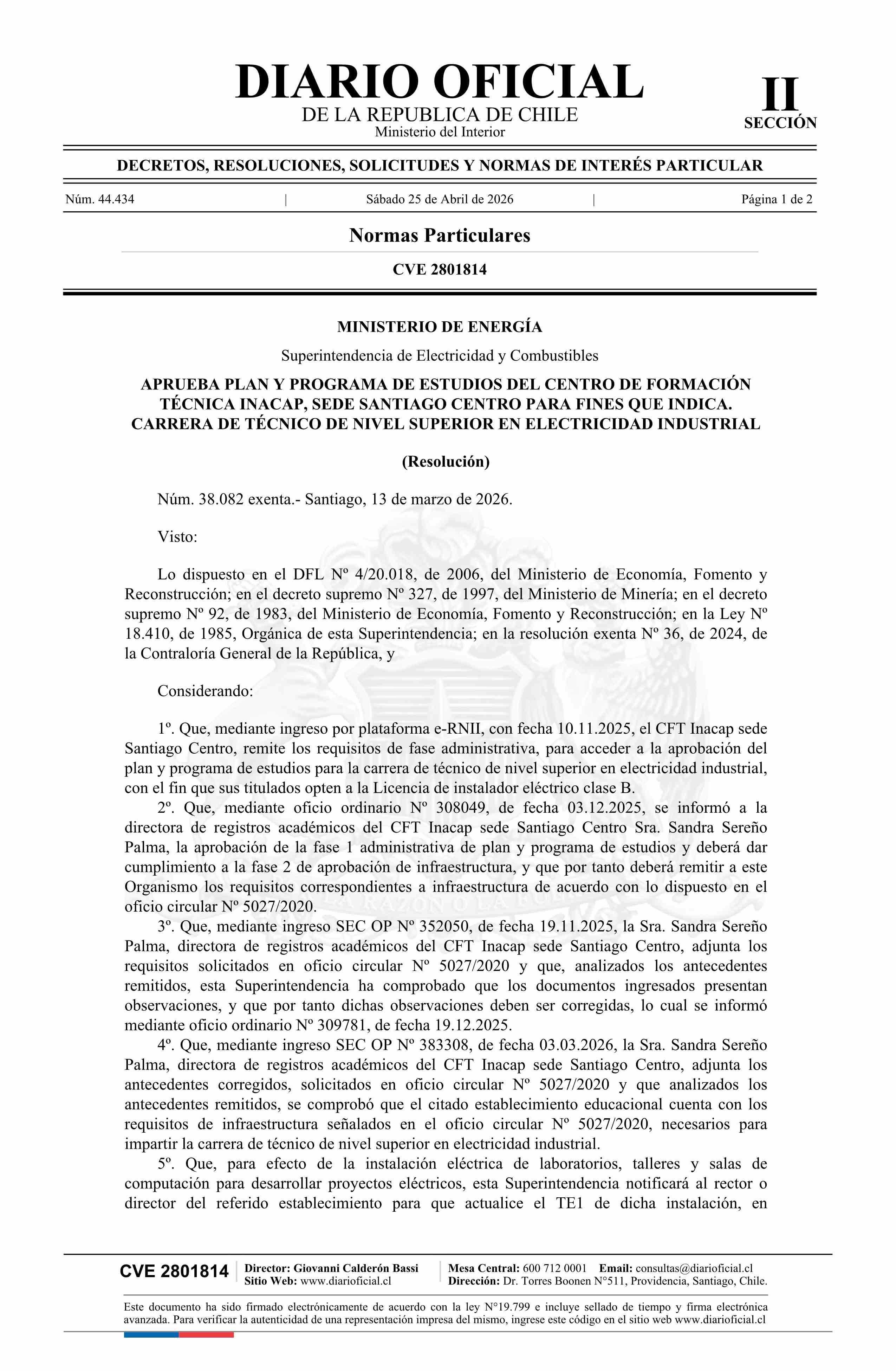 | Título: | Resolución exenta número 38.082, de 2026.- Aprueba plan y programa de estudios del centro de formación técnica Inacap, sede Santiago Centro, para fines que indica |