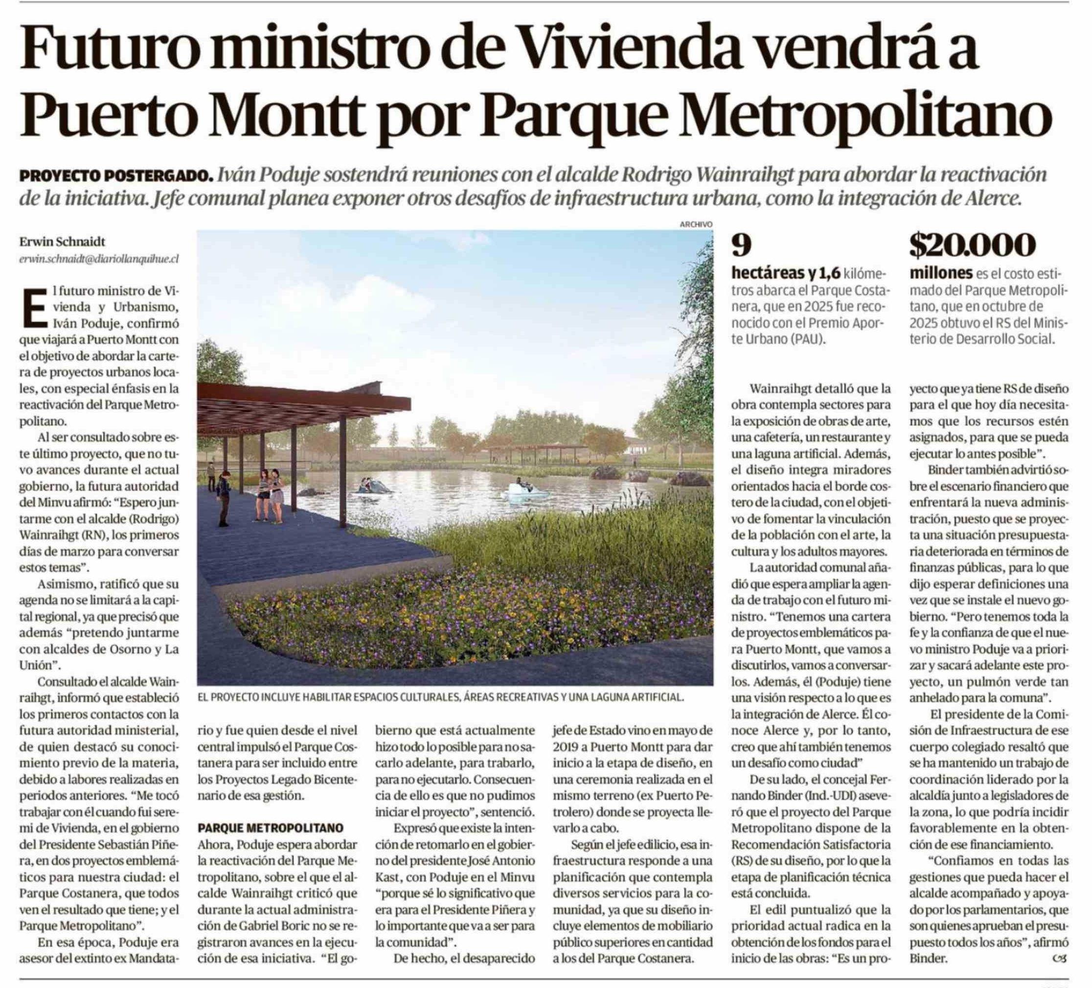 Futuro ministro de Vivienda vendrá a Puerto Montt por Parque Metropolitano