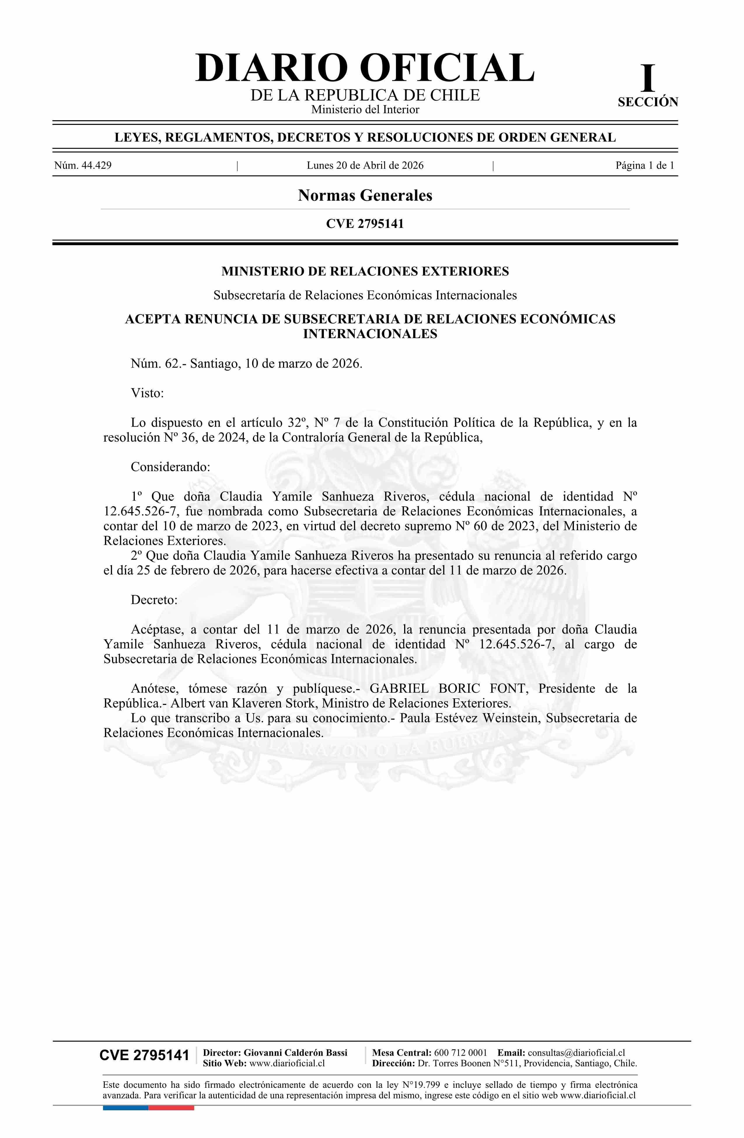 | Título: | Decreto número 62, de 2026.- Acepta renuncia de doña Claudia Yamile Sanhueza Riveros al cargo de Subsecretaria de Relaciones Económicas Internacionales |