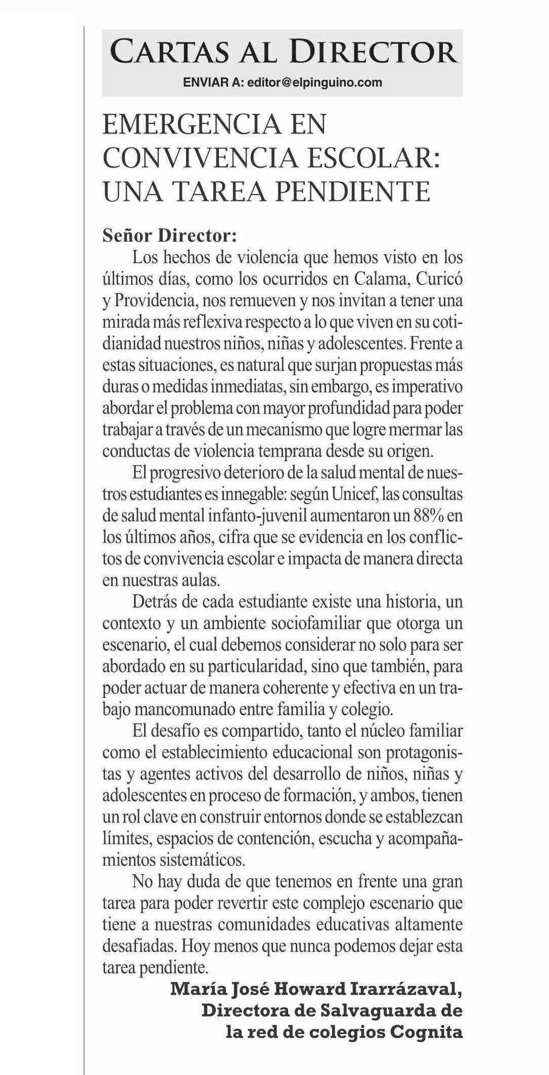 Título: CARTAS: EMERGENCIA DE CONVIVENCIA ESCOLAR UNA TAREA PENDIENTE