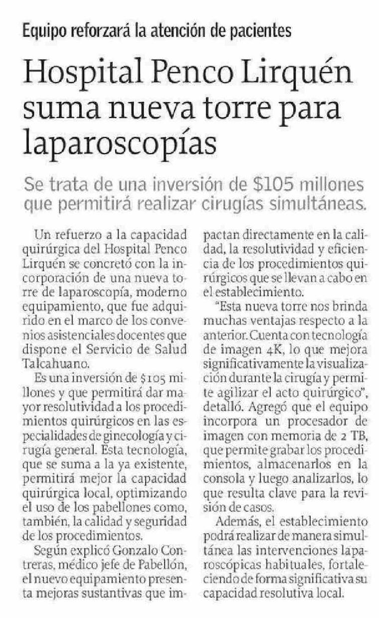 Título: Hospital Penco Lirquén suma nueva torre para laparoscopías