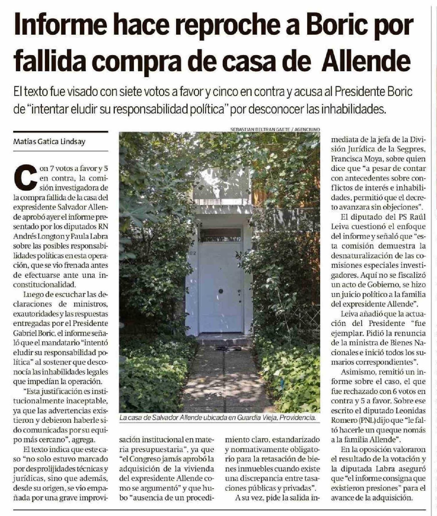 Informe hace reproche a Boric por fallida compra de casa de Allende