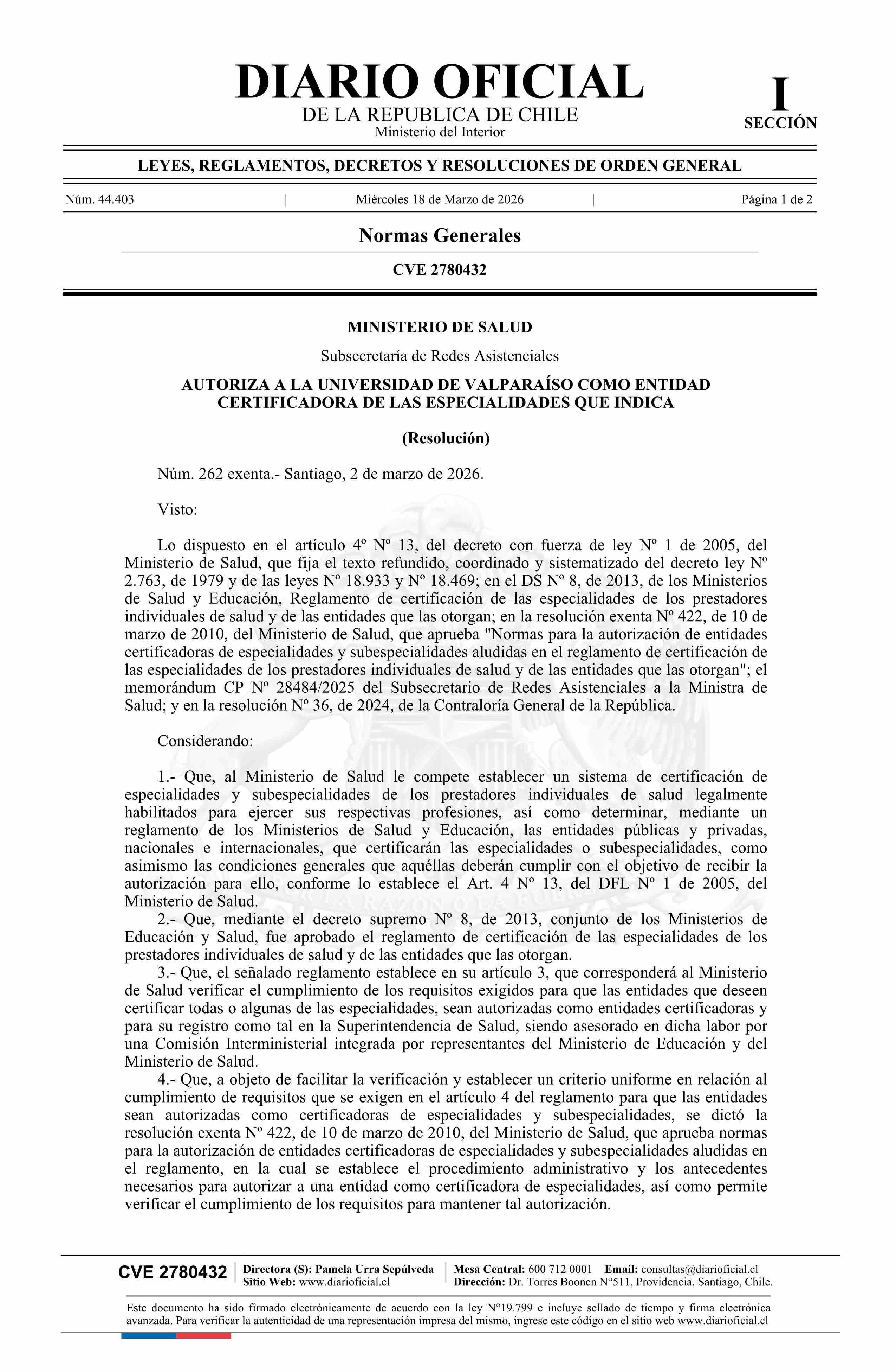 | Título: | Resolución exenta número 262, de 2026.- Autoriza a la Universidad de Valparaíso como entidad certificadora de las especialidades que indica |