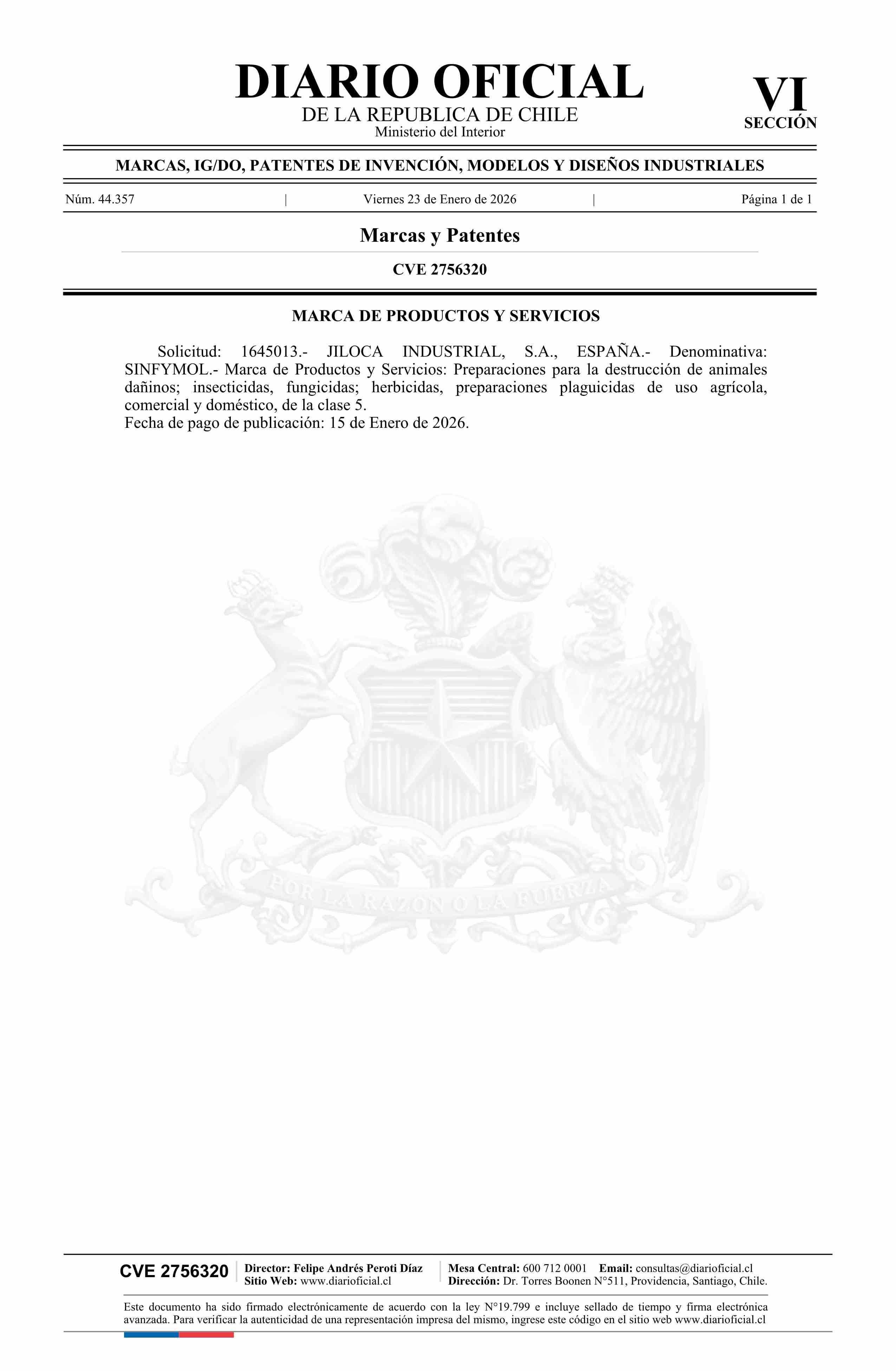Diario Oficial Edición Electrónica (Diario Oficial de Chile - 6 Marcas Y Patentes)
