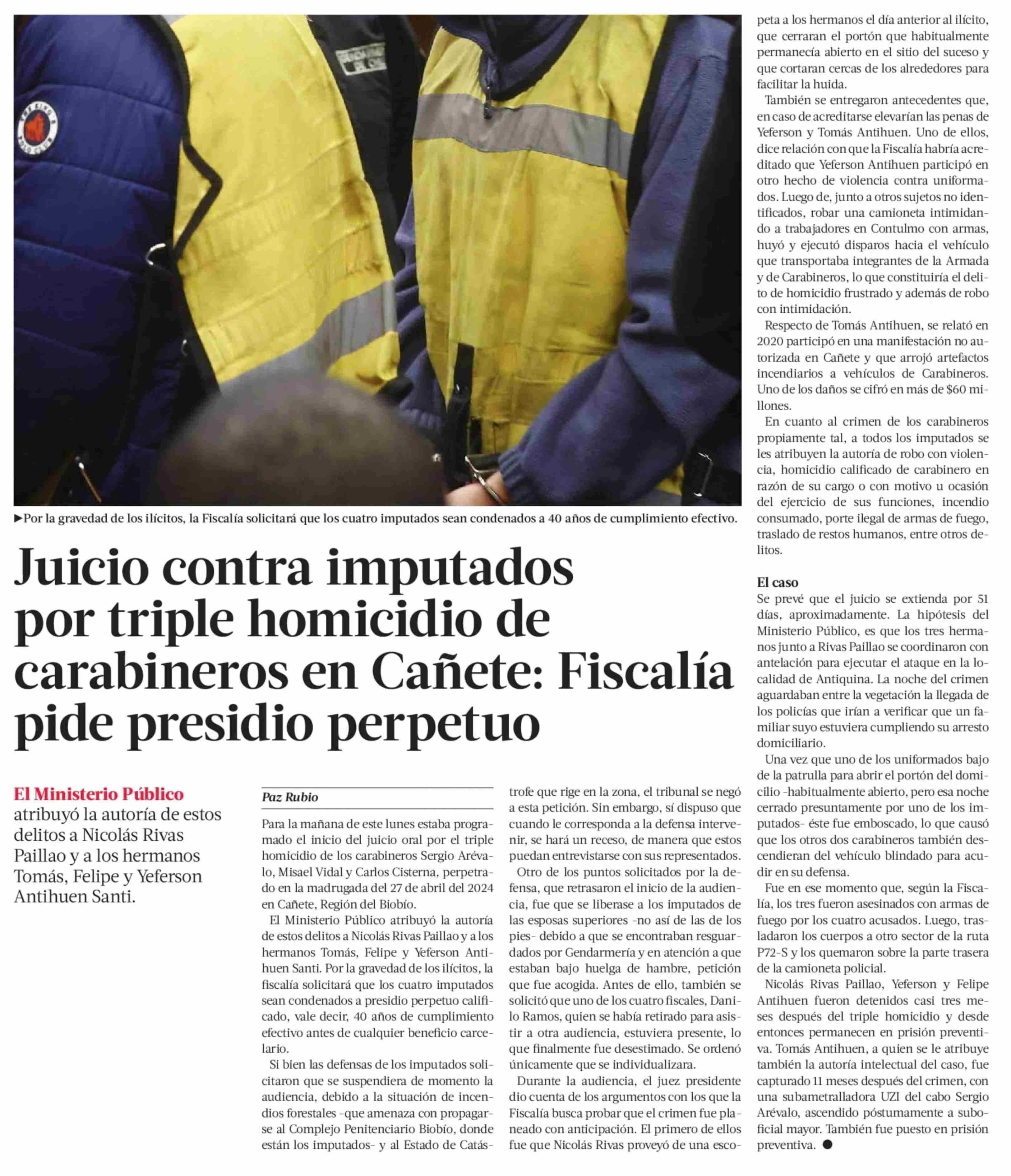 Juicio contra imputados por triple homicidio de carabineros en Cañete: Fiscalía pide presidio perpetuo