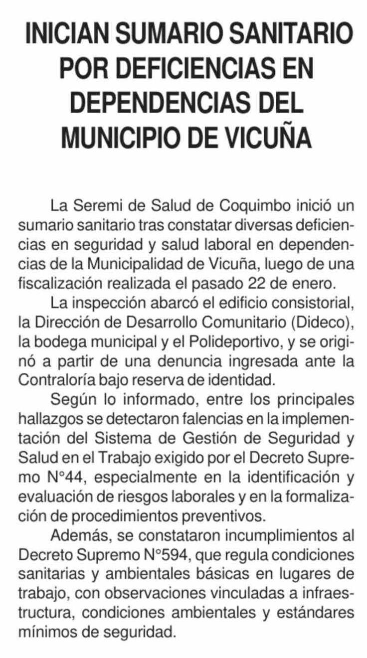 INICIAN SUMARIO SANITARIO POR DEFICIENCIAS EN DEPENDENCIAS DEL MUNICIPIO DE VICUÑA