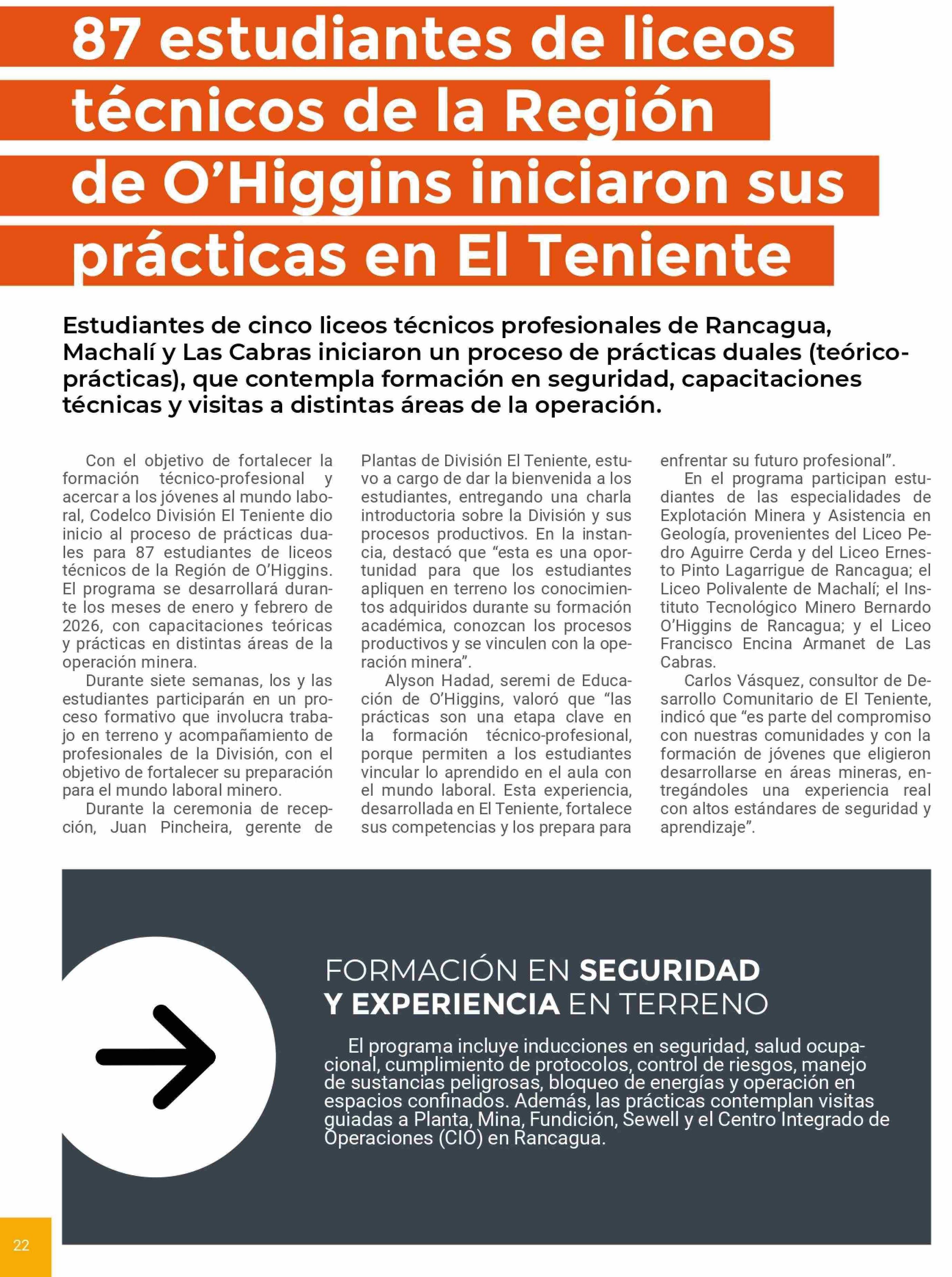 87 Estudiantes de liceos técnicos de la Región de O'Higgins iniciaron sus prácticas en El Teniente