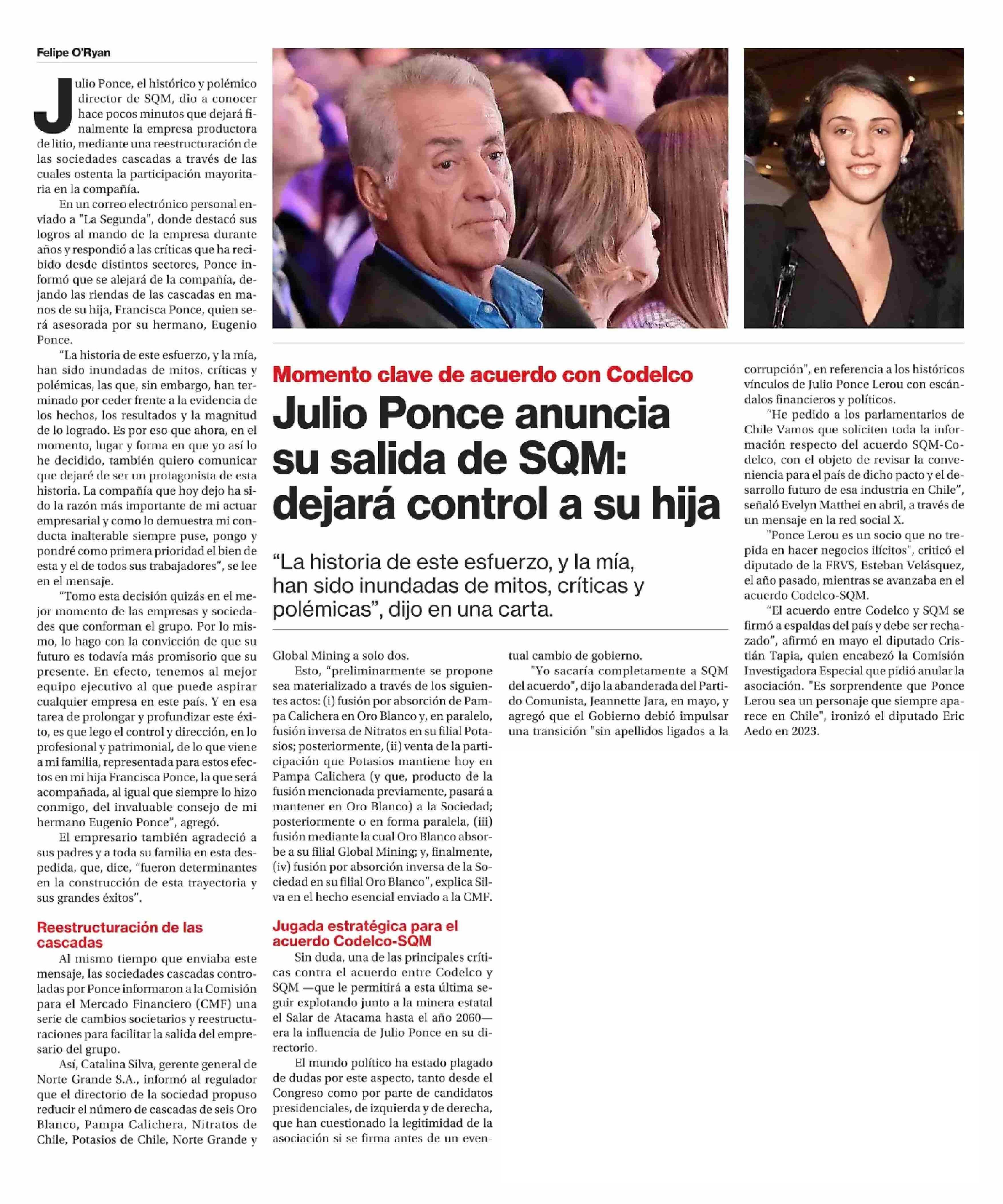 Julio Ponce anuncia su salida de SQM: dejará control a su hija