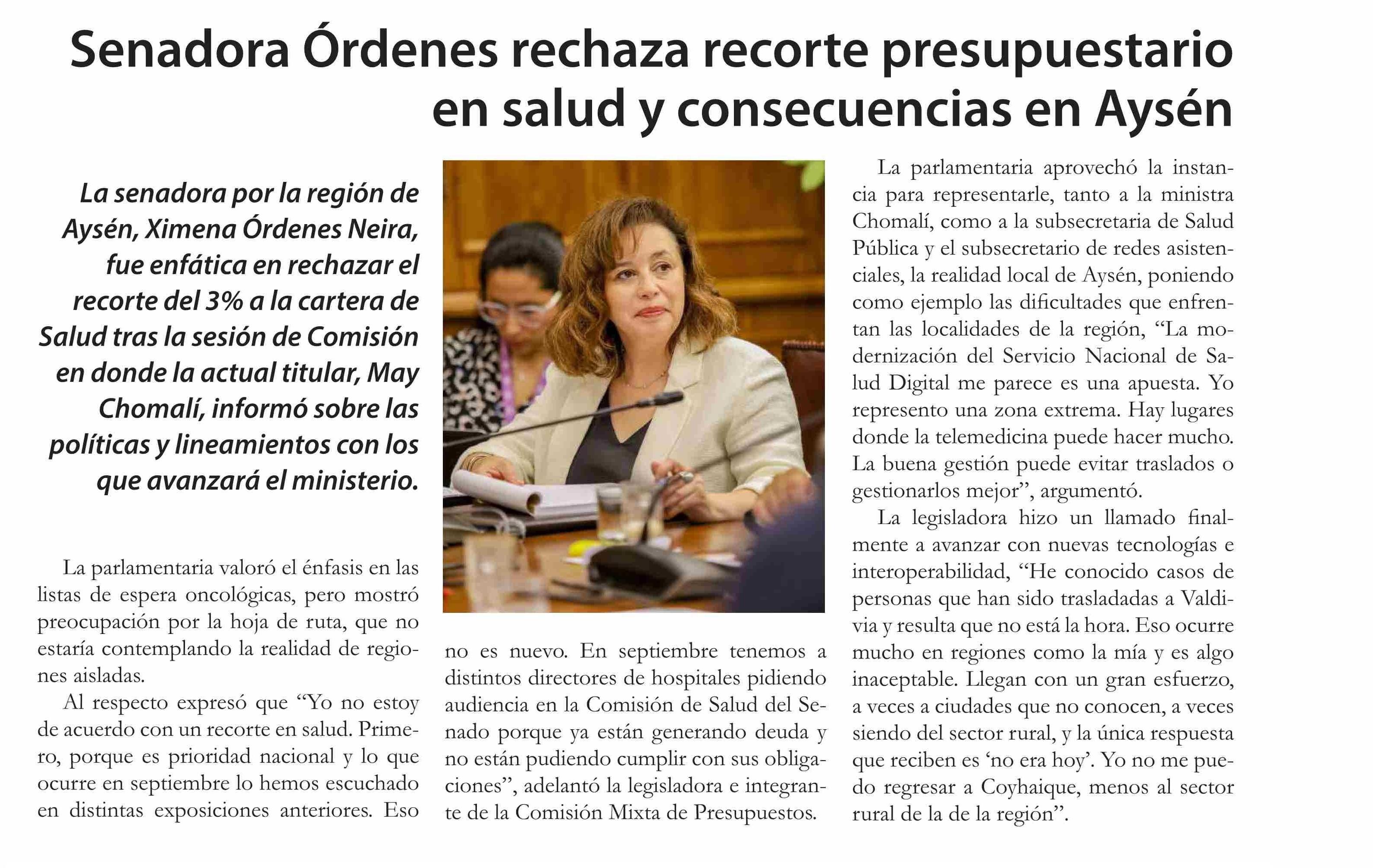 Senadora Órdenes rechaza recorte presupuestario en salud y consecuencias en Aysén