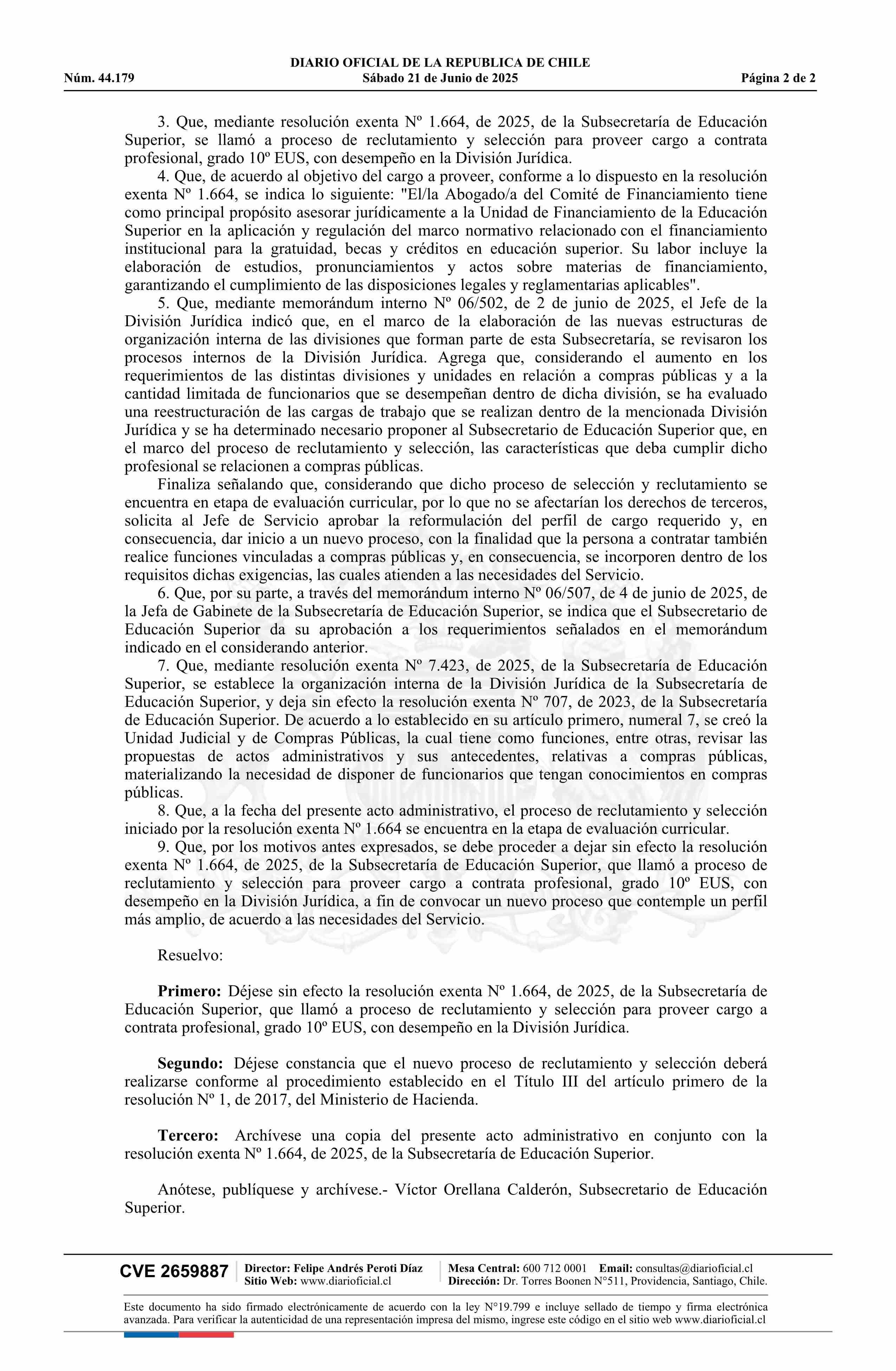 | Título: | Resolución exenta número 7.427, de 2025.- Deja sin efecto resolución Nº 1.664 exenta, de 2025, que llamó a proceso de reclutamiento y selección para proveer cargo a contrata profesional, grado 10º EUS, con desempeño en la División Jurídica |
