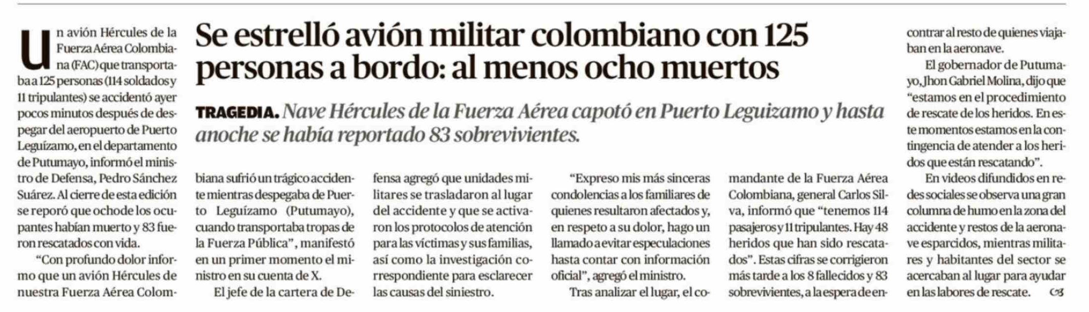 Se estrelló avión militar colombiano con 125 personas a bordo: al menos ocho muertos