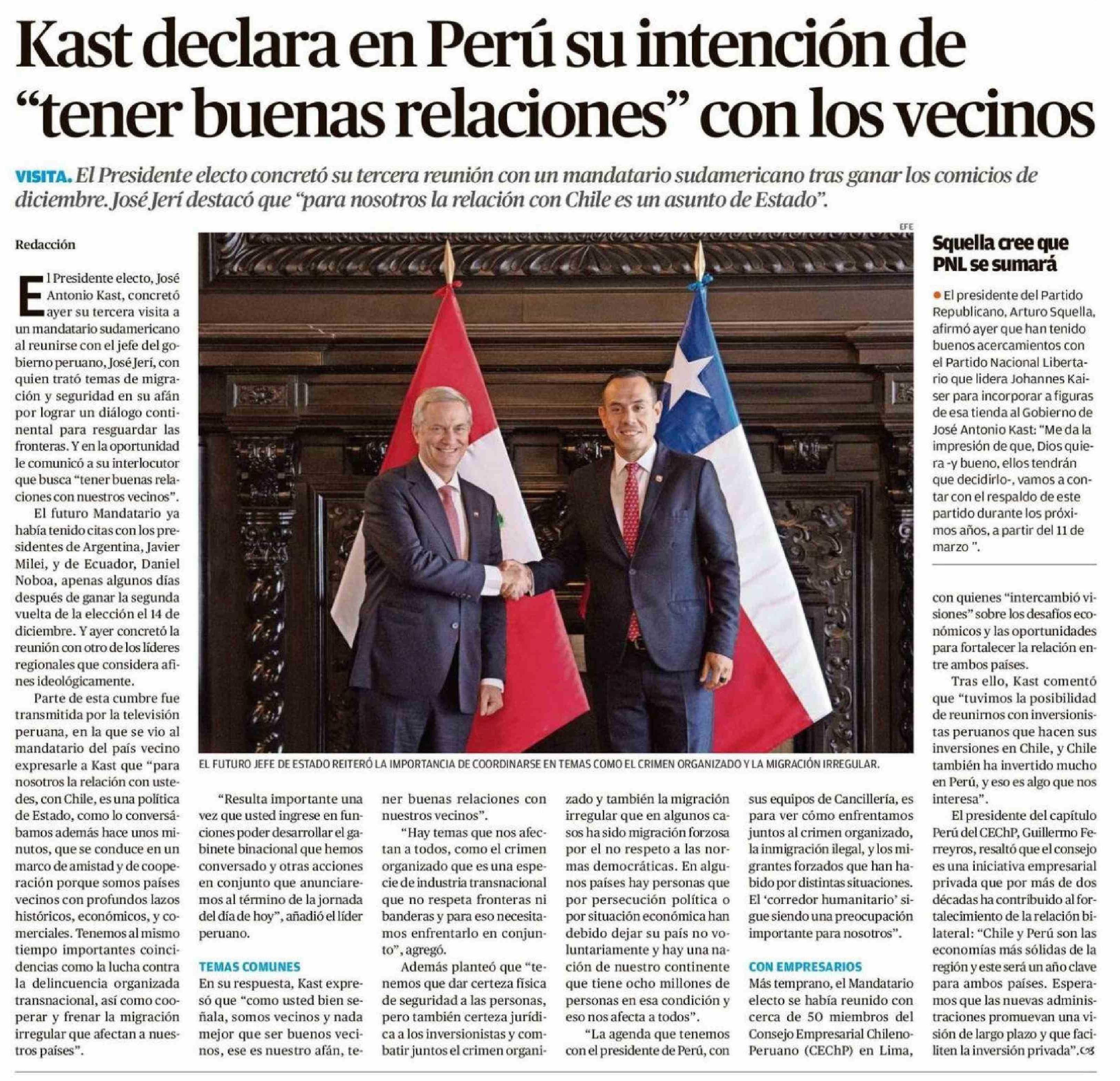 Kast declara en Perú su intención de "tener buenas relaciones" con los vecinos