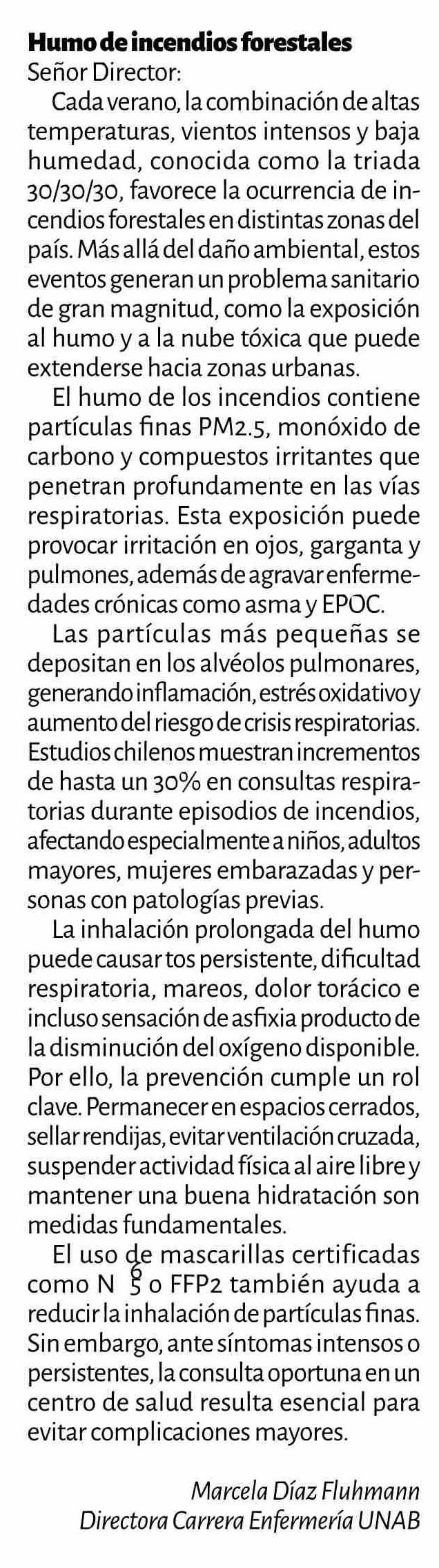 Título: Cartas: Humo de incendios forestales Señor Director: Cada verano, la combinación de altas temperaturas, vientos intensos y baja humedad, conocida como la triada 30/30/30, favorece la ocurrencia de incendios forestales en distintas zonas del país. Más allá del daño ambiental, estos eventos generan un