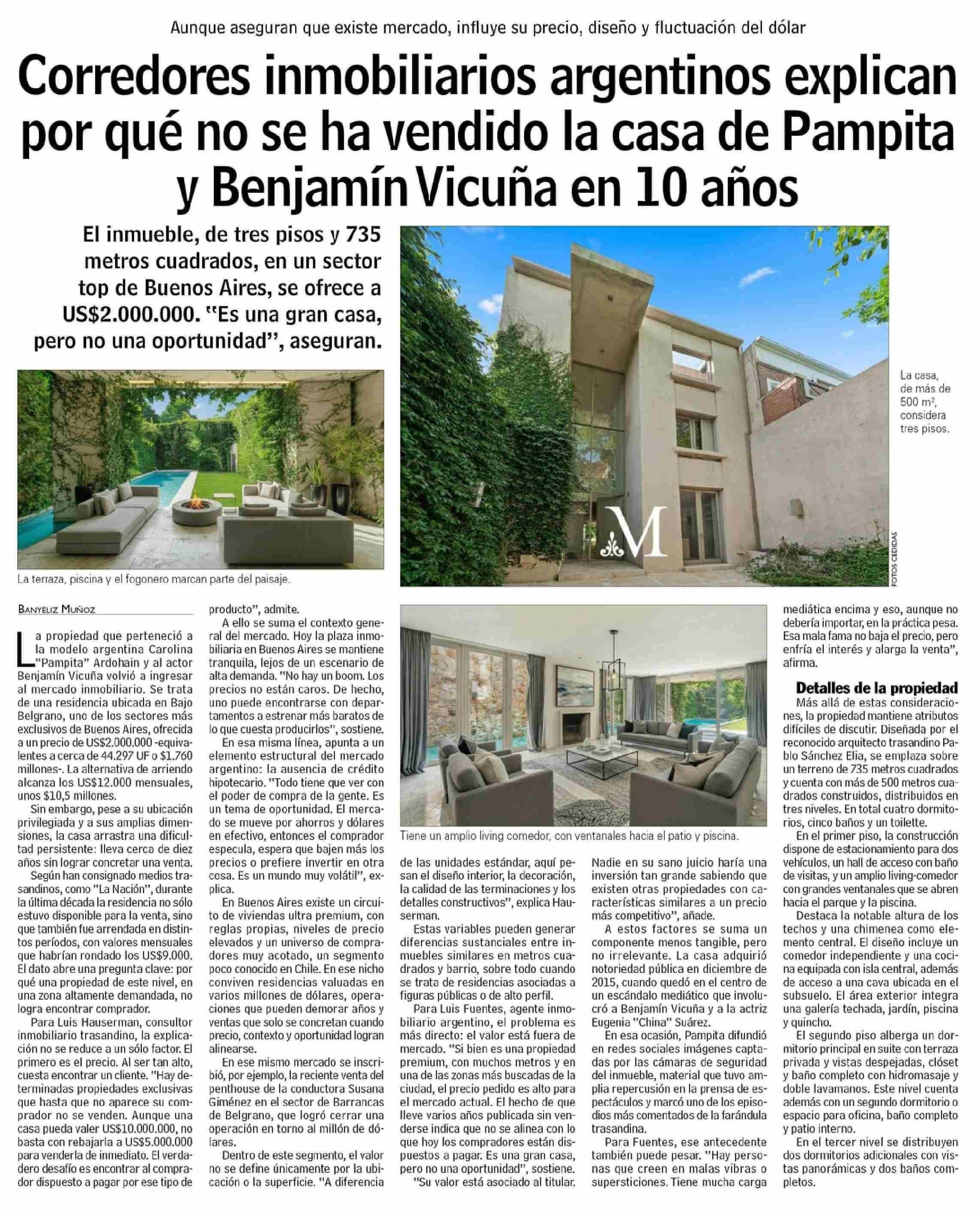 Corredores inmobiliarios argentinos explican por que no se ha vendido la casa de Pampita y Benjamín Vicuña en 10 años
