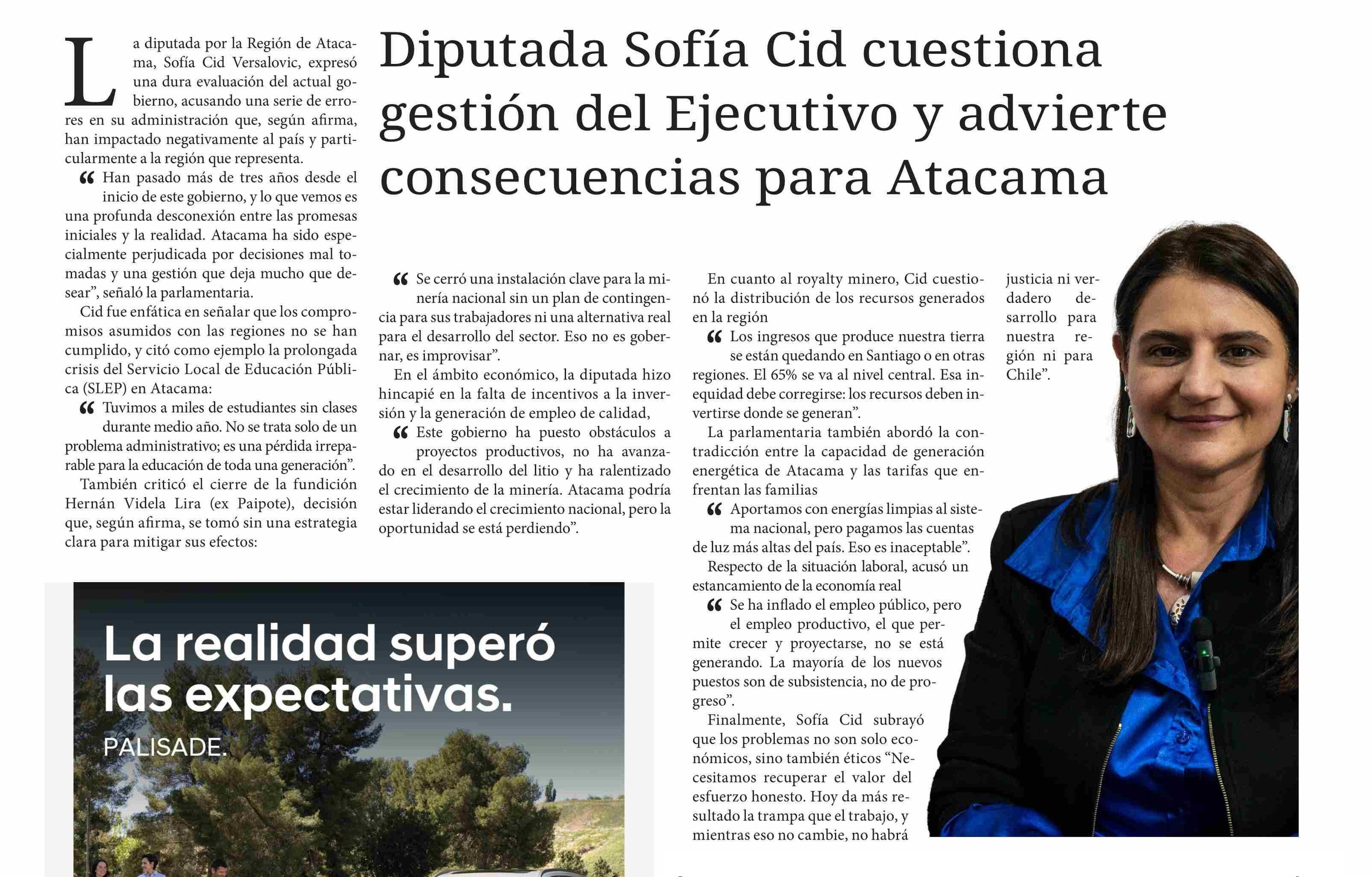 Diputada Sofía Cid cuestiona gestión del Ejecutivo y advierte consecuencias para Atacama