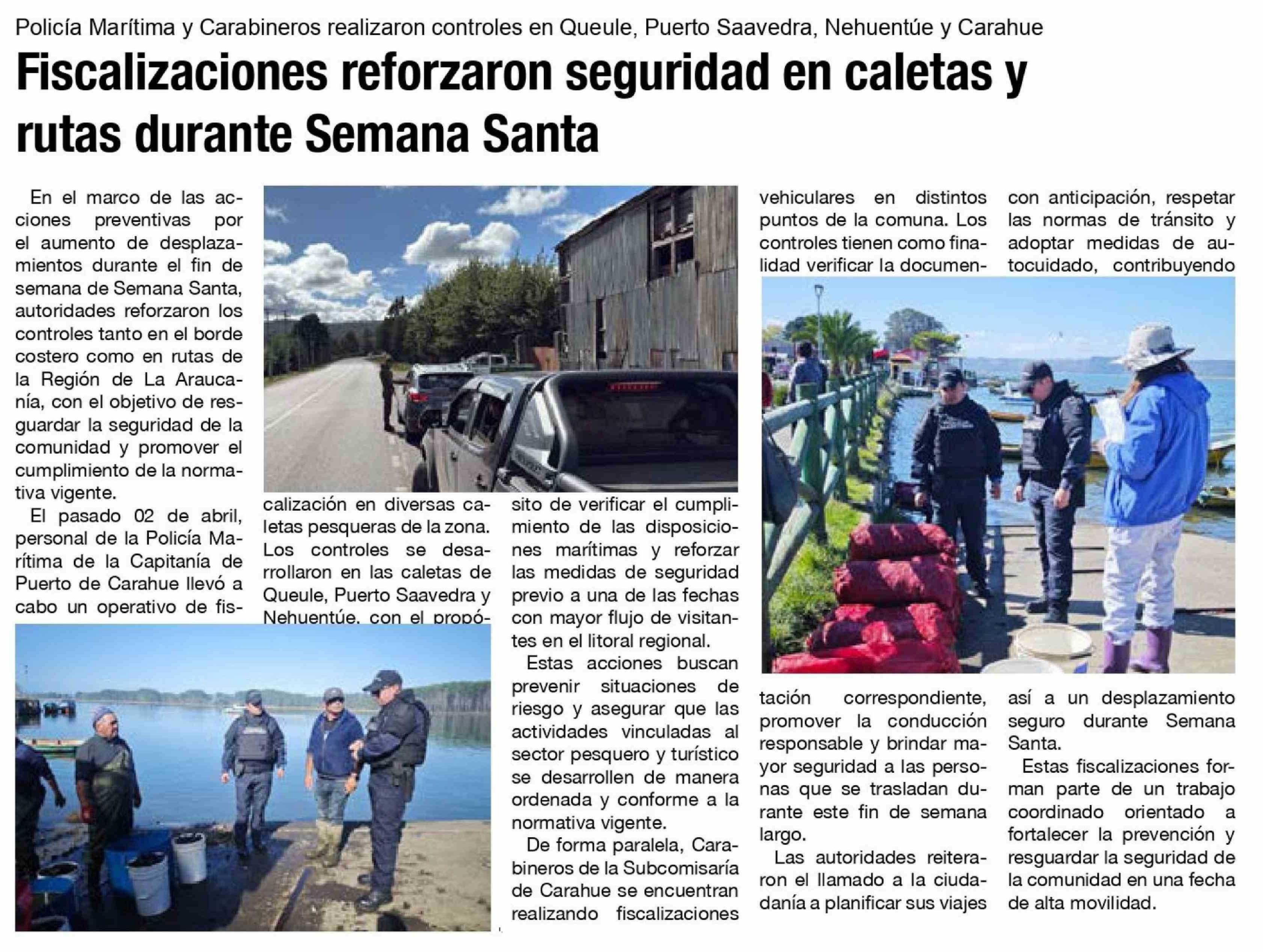 Fiscalizaciones reforzaron seguridad en caletas y rutas durante Semana Santa