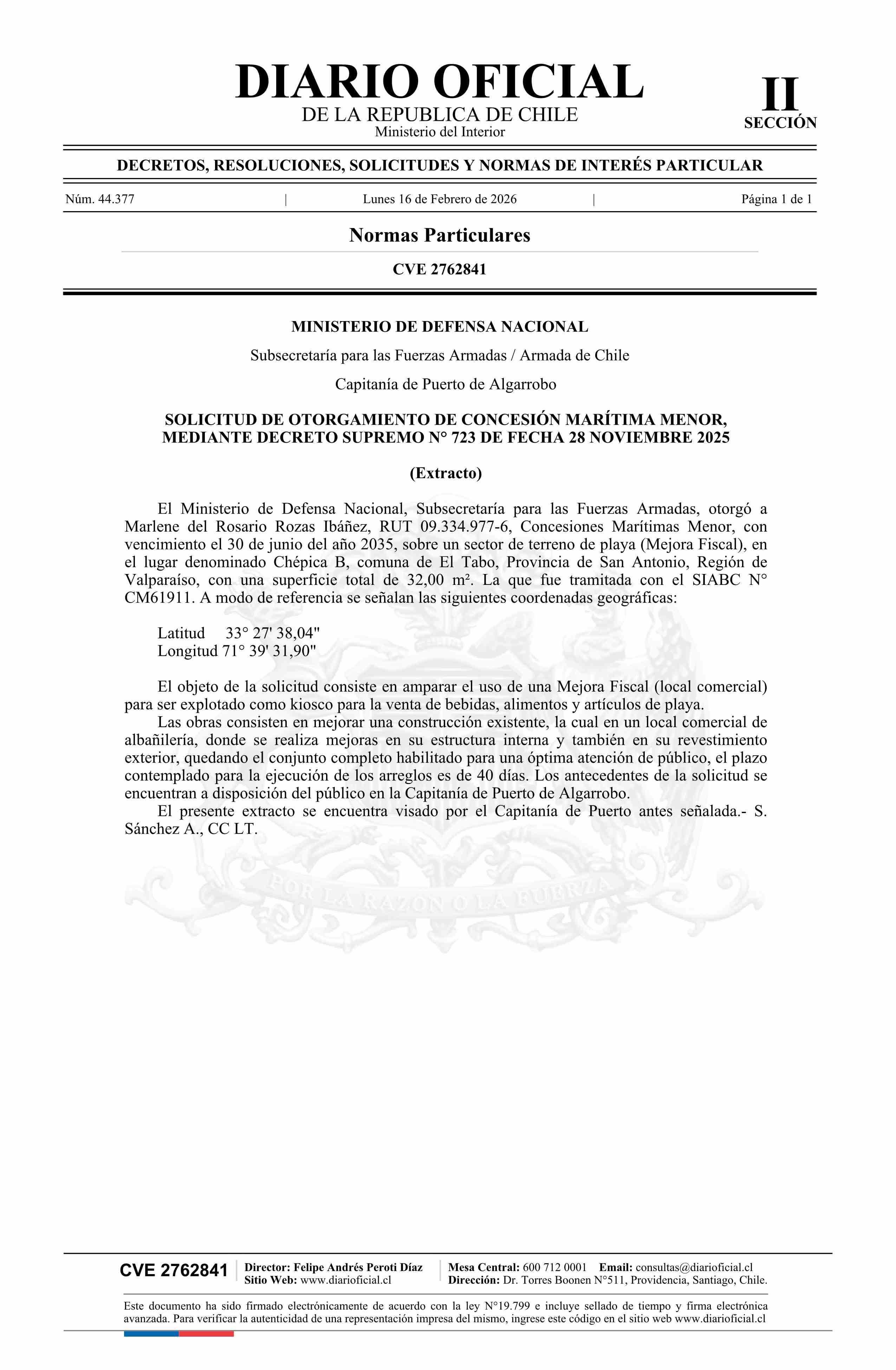 Extracto de decreto número 723, de 2025.- Otorgamiento de concesión marítima menor