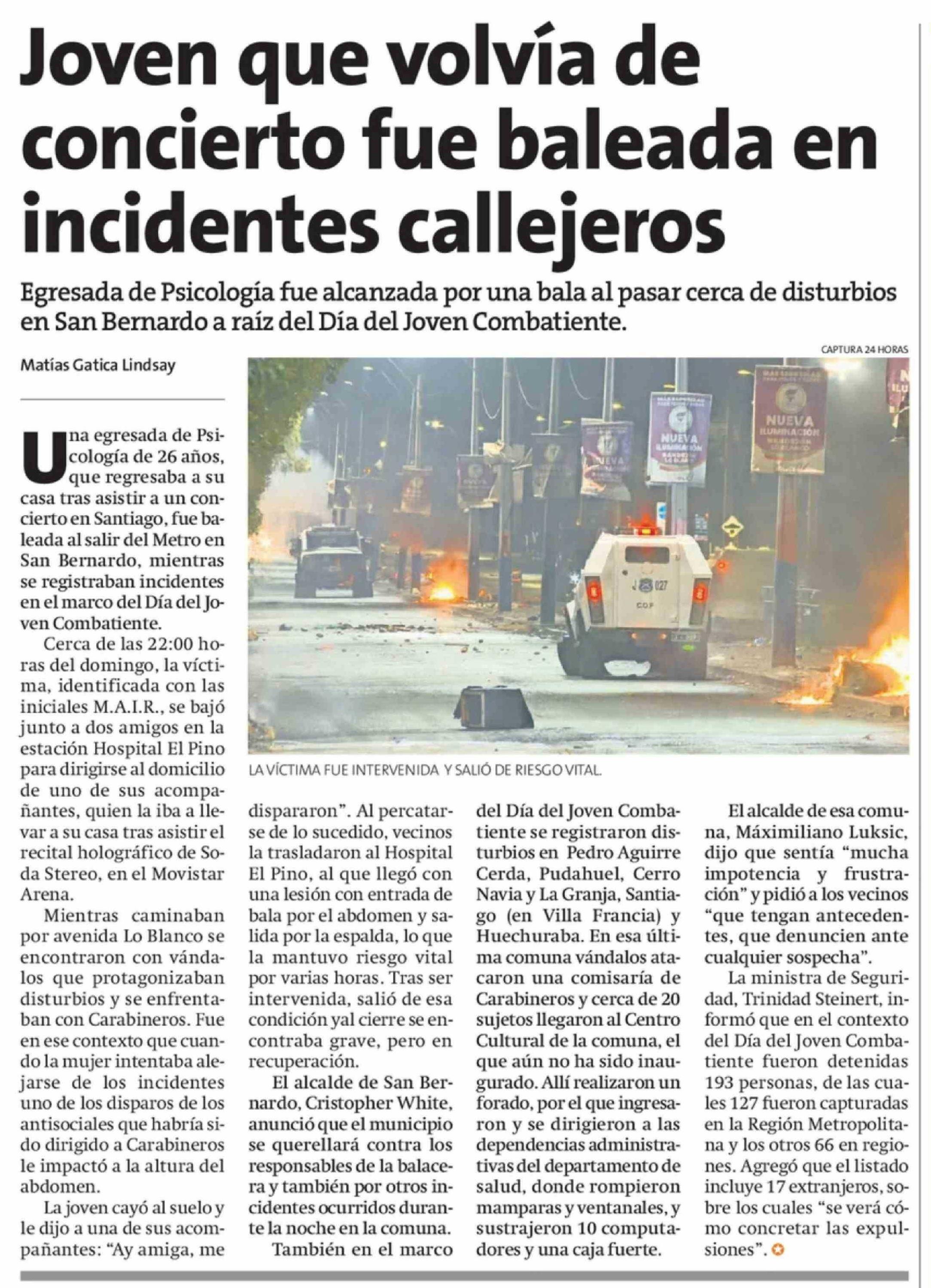 Joven que volvía de concierto fue baleada en incidentes callejeros