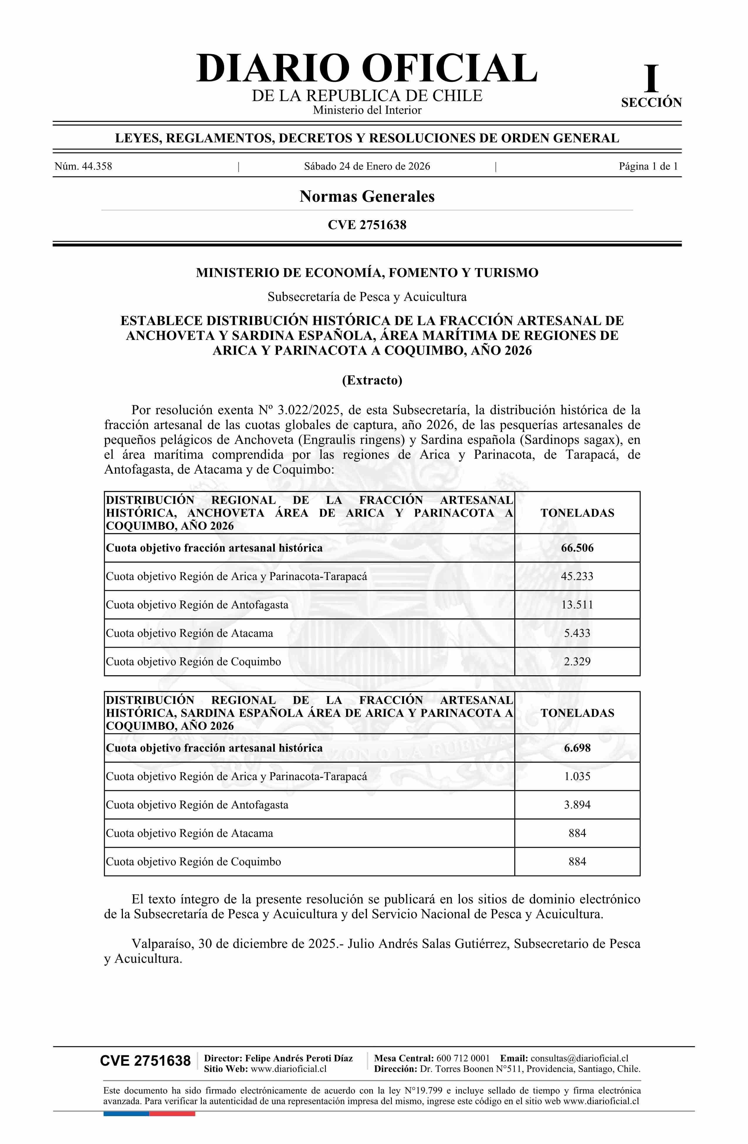 Título: Extracto de resolución exenta número 3.022, de 2025.- Establece distribución histórica de la fracción artesanal de Anchoveta y Sardina española, área marítima de regiones de Arica y Parinacota a Coquimbo, año 2026