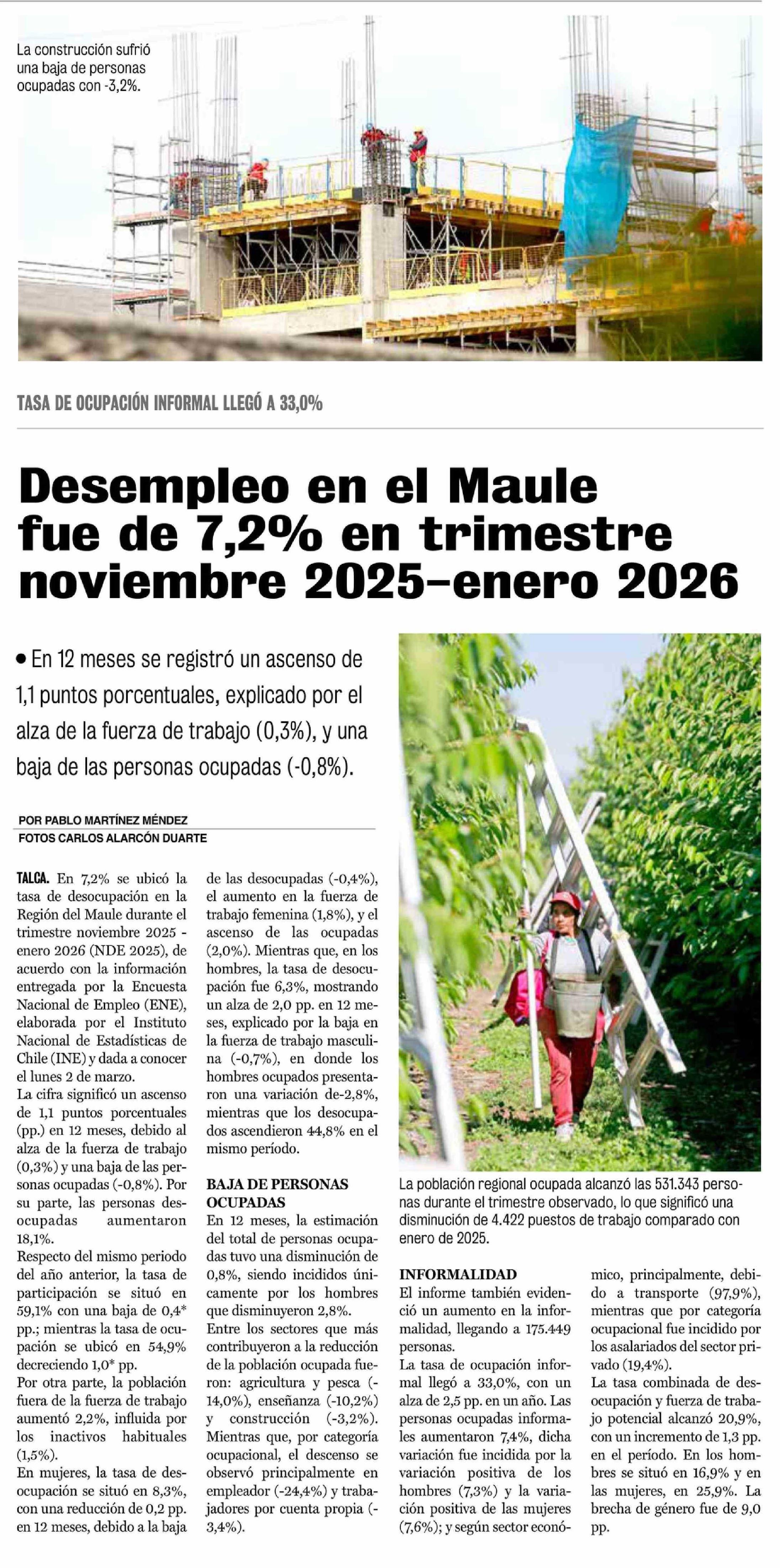 Desempleo en el Maule fue de 7,2% en trimestre noviembre 2025-enero 2026