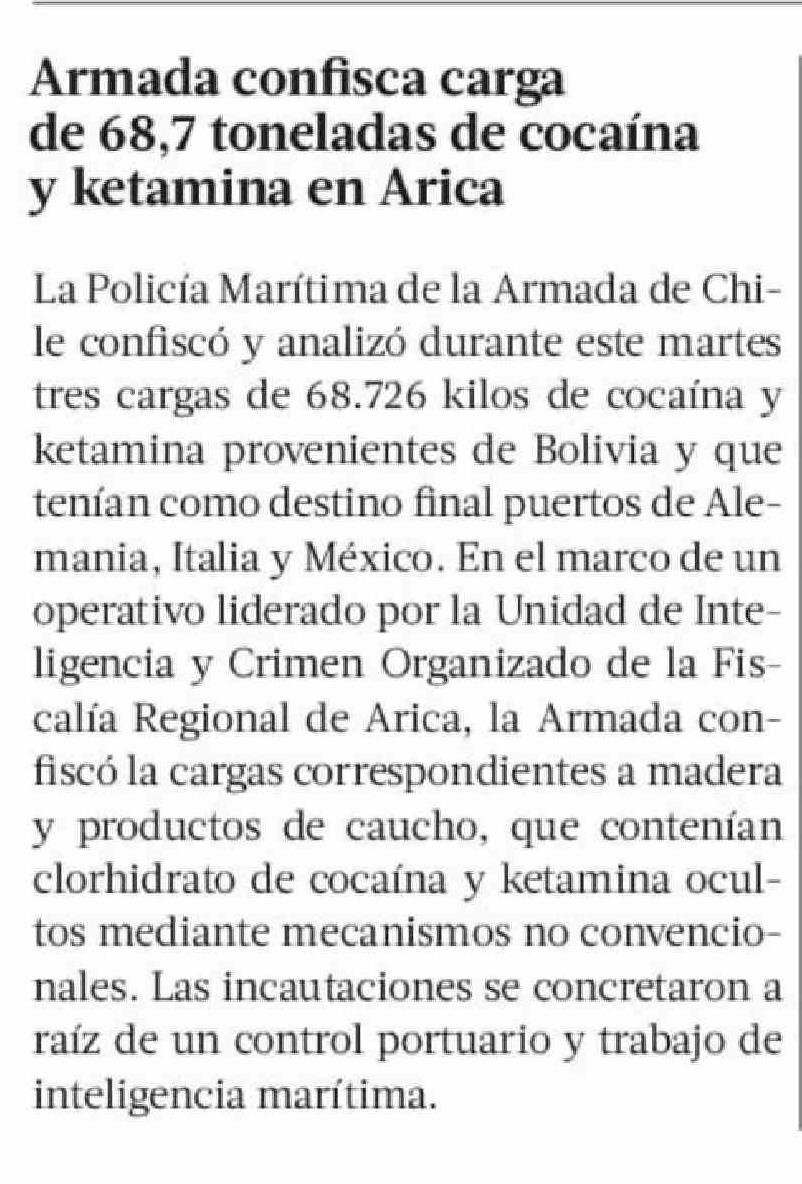 Armada confisca carga de 68,7 toneladas de cocaína y ketamina en Arica