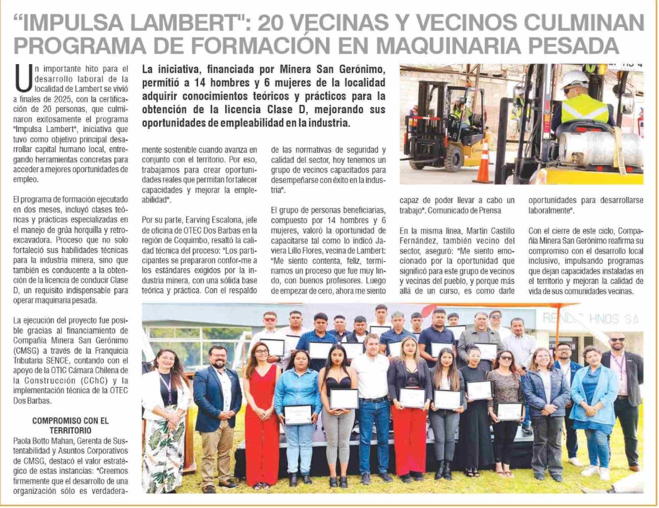 "IMPULSA LAMBERT": 20 VECINAS Y VECINOS CULMINAN PROGRAMA DE FORMACIÓN EN MAQUINARIA PESADA